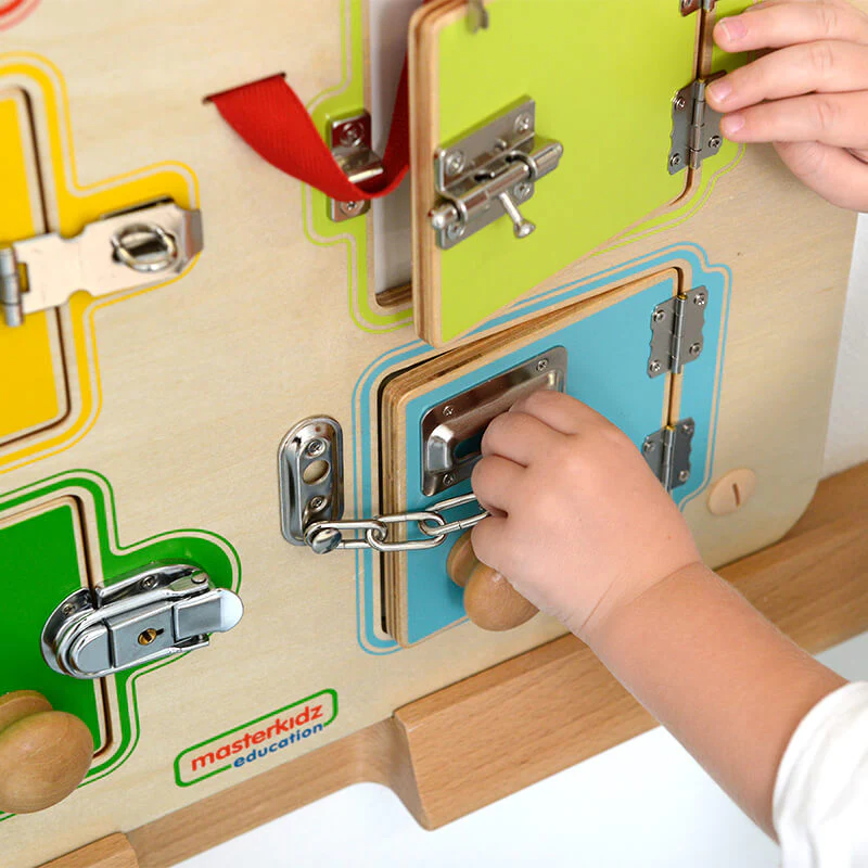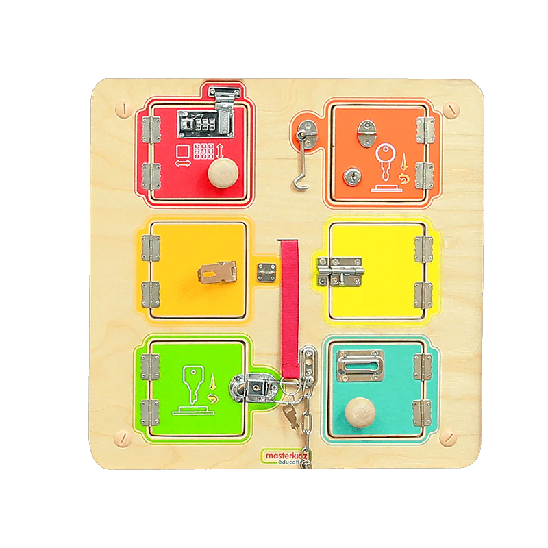 Панель для обучения включает в себя 6 закрытых и запертых дверей, в каждой из которых есть место для карточки или фотографии. Кроме того, поверхность под дверями изготовлена из материала, на котором можно писать и стирать текст.