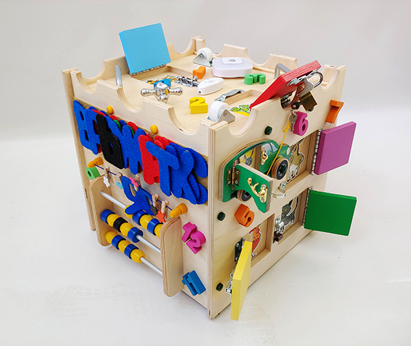 Высококачественный развивающий куб из толстой фанеры. Все детали отфрезерованы, отшлифованы, покрыты экологически чистым лаком. Соединения закрыты колпачками.