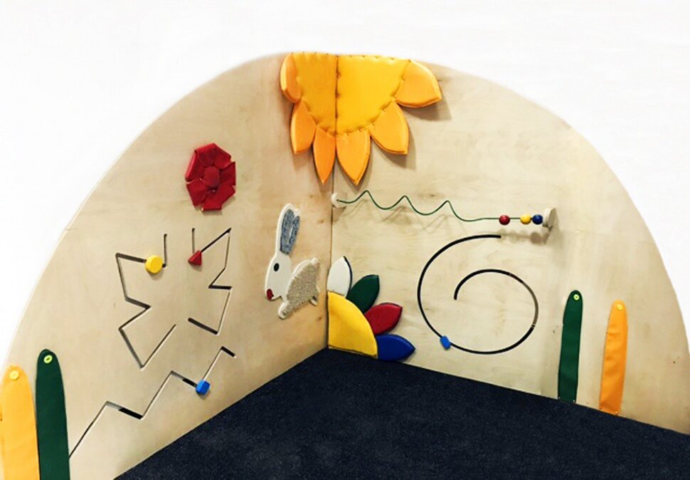 Уголок с яркими элементами различных форм включает в себя лабиринты, перекладину с геометрическими фигурами, элементы из тканей различной фактуры.