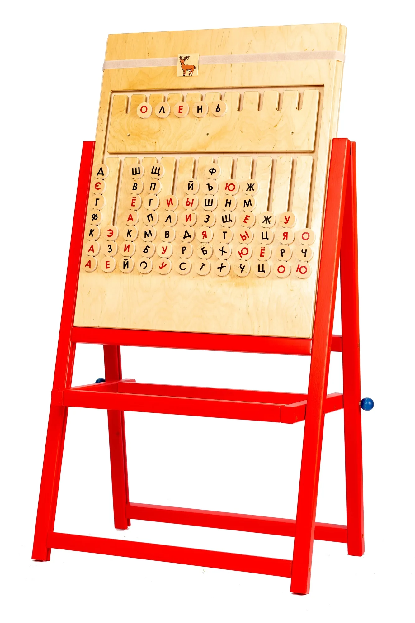 На одной стороне панели в прорезях расположены фишки с буквами русского алфавита (гласные красные, согласные черные), которые необходимо передвигать для составления слова. На другой - в прорезях находятся фишки с цифрами и арифметическими знаками, для составления и решения примеров.