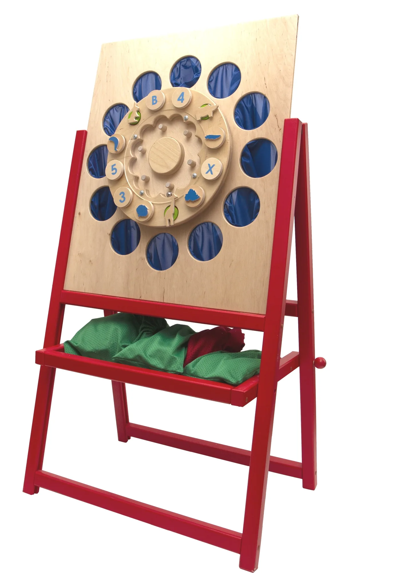 На игровом поле панели размещены: «рулетка» - крутящийся диск с перемещающимся металлическим «указателем» - шариком и вокруг по диску 12 кружочков - магнитов для прикрепления пособий на магнитах; вокруг «рулетки» - диска выпилено 12 круглых «окошек», в которых спрятаны 12 синих «волшебных» мешочков – «тайничков». К стенду «Сенсино» прилагаются пособия - 4 мешочка с помещенными в них деревянными игровыми комплектами (дидактическими материалами).