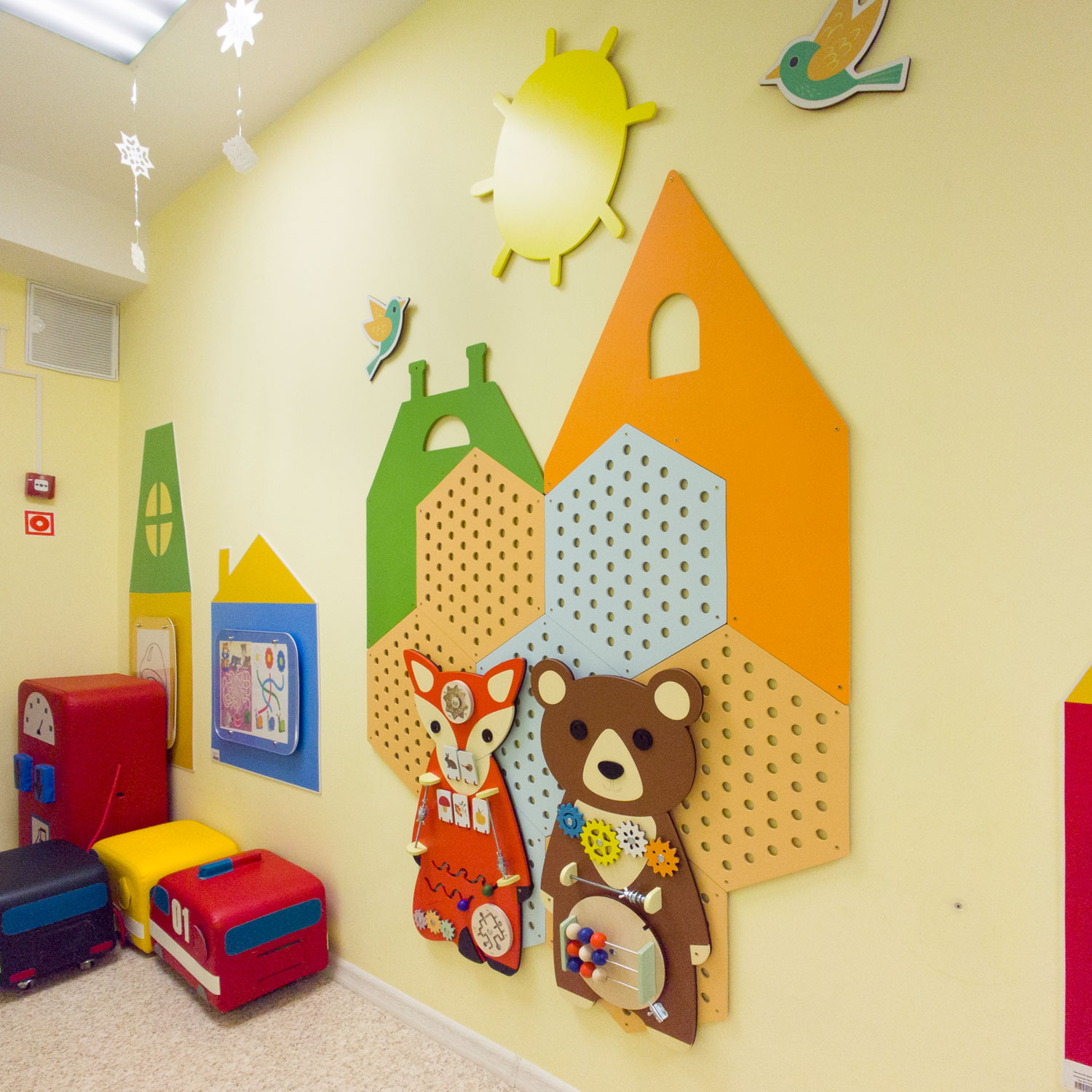 Комплект перфорированных настенных панелей с декоративным оформлением. Это готовый вариант для оформления стен в группе, коридоре детского сада.