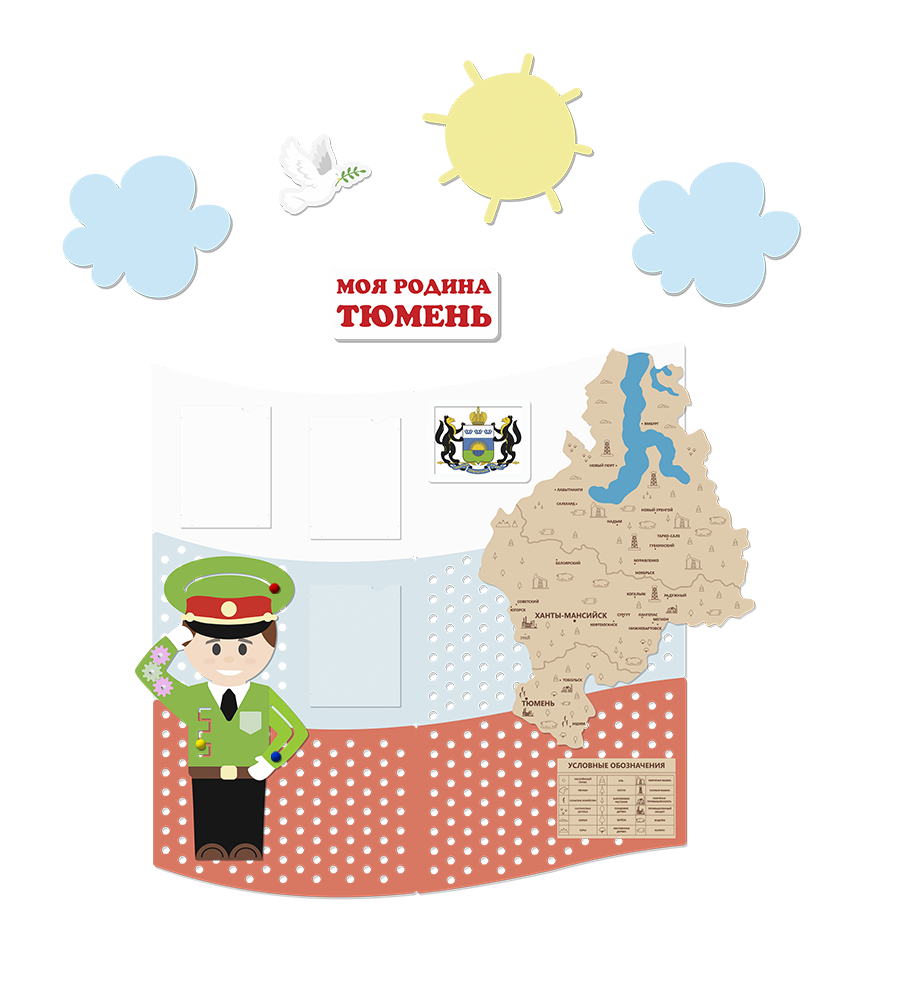 Комплект панелей оптимального размера — 180 см в ширину. Его можно разместить в коридоре, холле детского сада даже при недостатке свободного места. Каждый день проходя мимо патриотического уголка, играя с подвижными элементами бизиборда, дети запоминают символику, цвета, понятия о Родине.