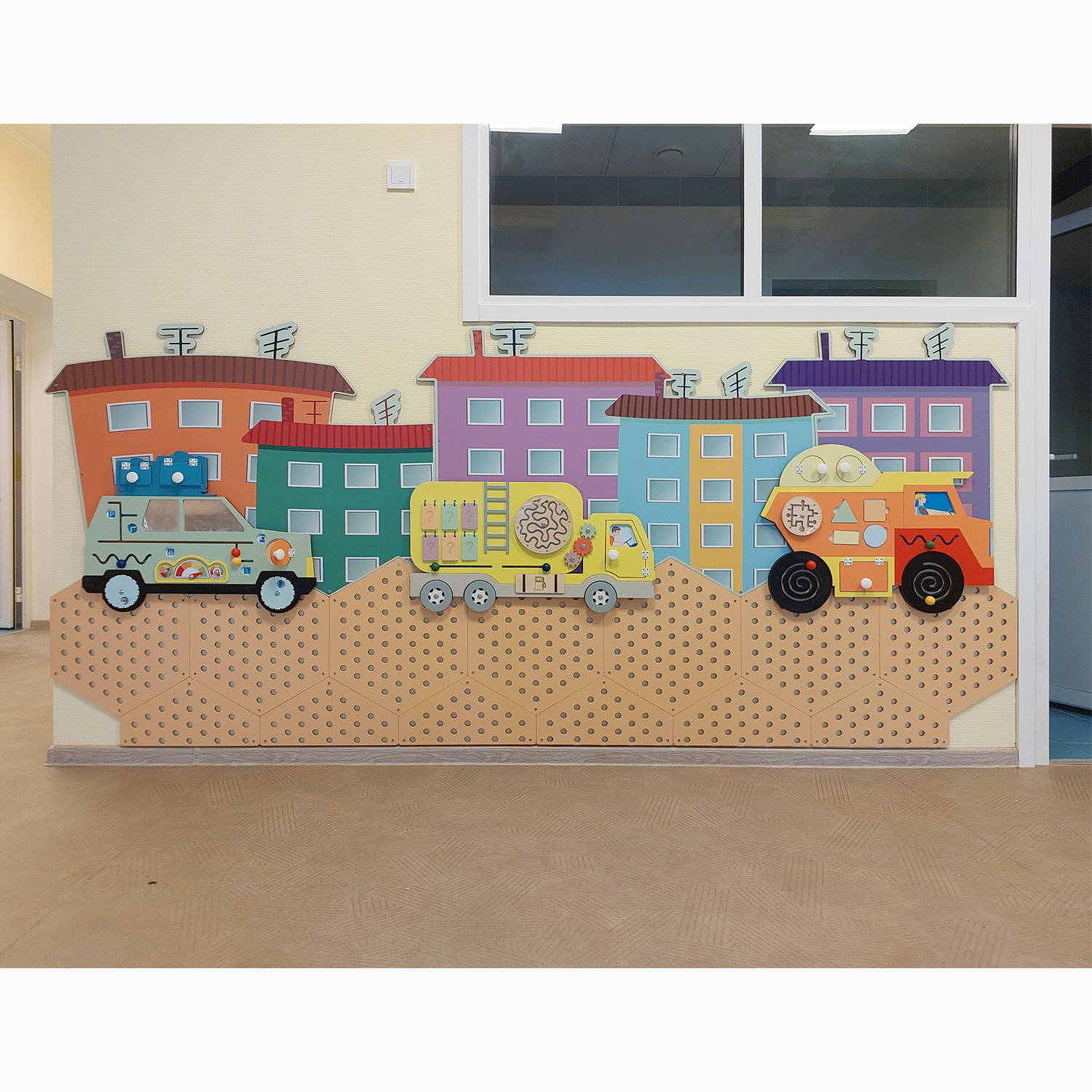 Комплект перфорированных настенных панелей с декоративным оформлением. Это готовый вариант для оформления стен в группе, коридоре детского сада.