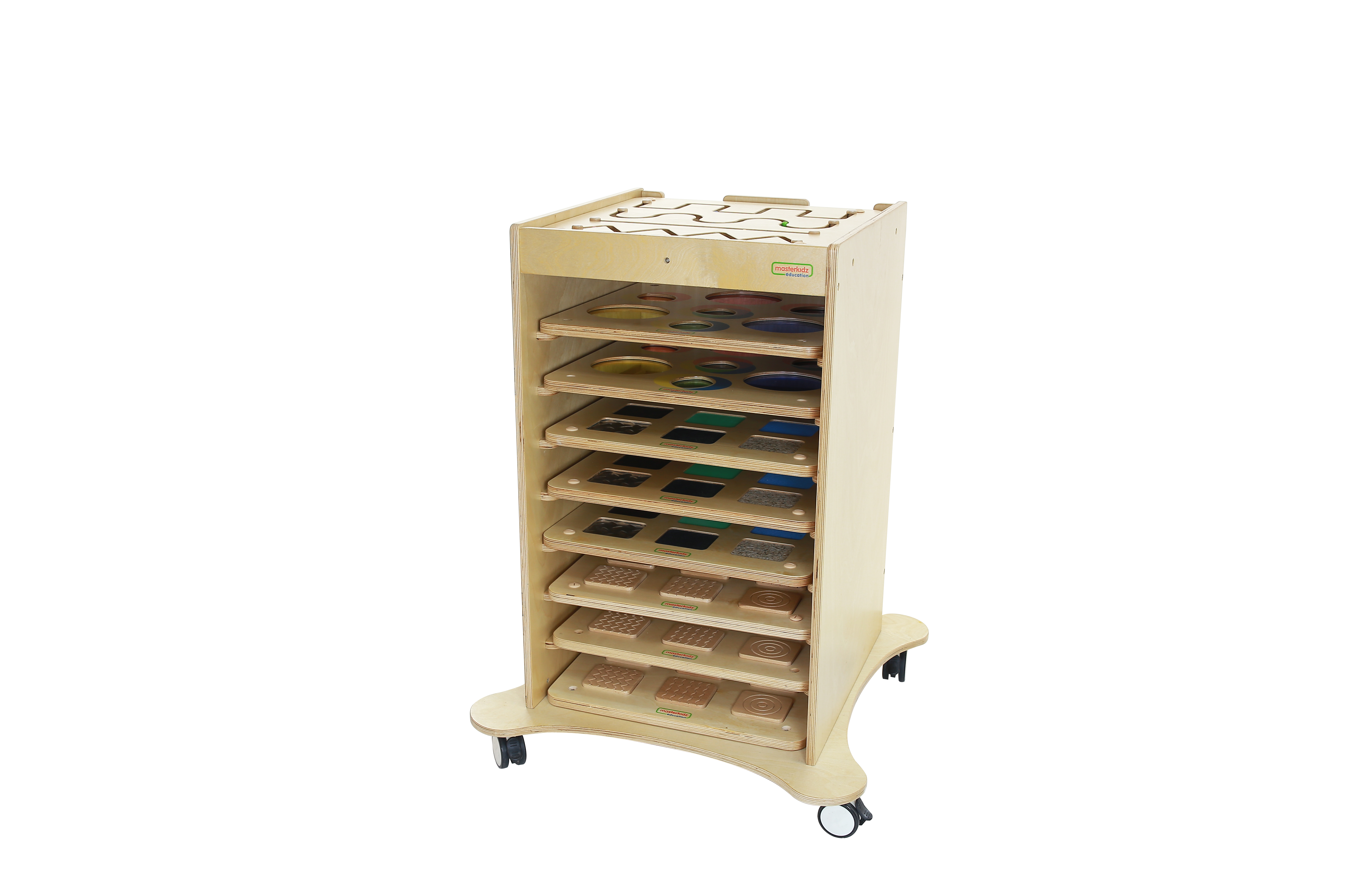 Игровой набор из 51 деревянных блоков различной геометрической формы и размеров с акриловыми зеркальными и прозрачными разноцветными вставками.