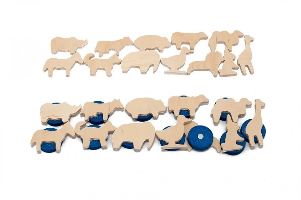 №1) 12 магнитных плоских фигурок животных и 12 их дублей без магнитов;