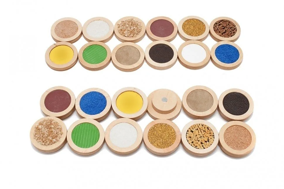 № 4) 12 тактильных кружочков с поверхностями различной на ощупь фактуры на магнитах и 12 их дублей;