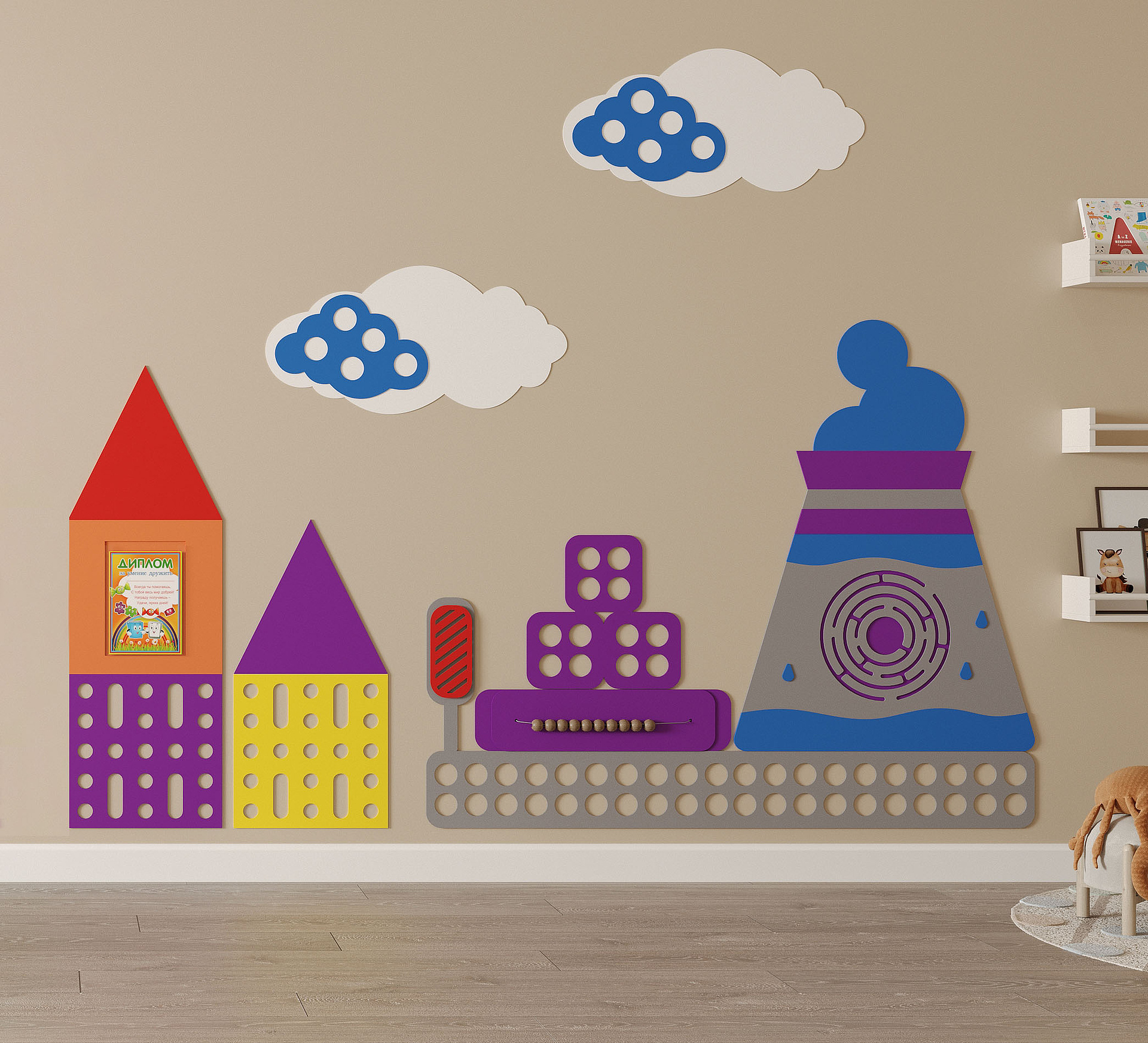 Настенная панель "Инженерно-логическая" способствует формированию таких навыков как развитие логического мышления, умение выстраивать последовательные цепочки событий, формирование гипотез и их доказательство. Такая панель позволяет проводить тематические игры не только на тему производства и техники, но и осудить актуальную в настоящее время тему экологии!