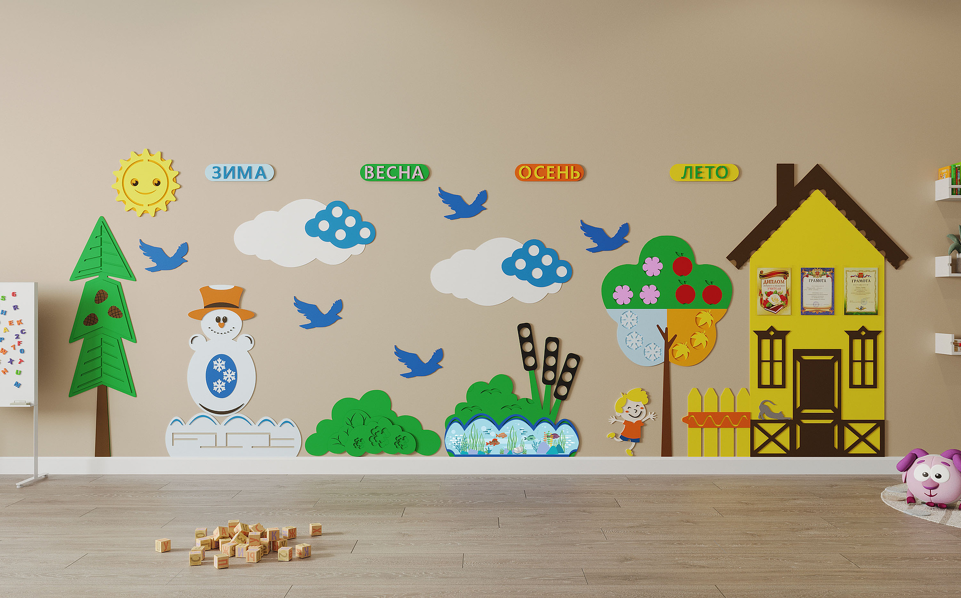 Настенная панель "Окружающая среда" познакомит детей с четырьмя временами года, а также научит ориентироваться в календарных месяцах и числах. Передвигайте ползунок на панели каждый день в зависимости от даты, сделайте это ежедневным ритуалом, с которого начинается день в вашем ДОУ. Такая настенная панель не только украсит стену, но и позволит создать интерактивные игры - "Рыбалка" или "Лепим снеговика".