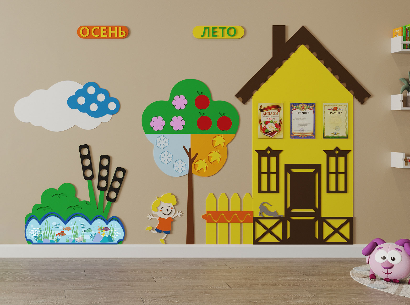 Настенная панель "Окружающая среда" познакомит детей с четырьмя временами года, а также научит ориентироваться в календарных месяцах и числах. Передвигайте ползунок на панели каждый день в зависимости от даты, сделайте это ежедневным ритуалом, с которого начинается день в вашем ДОУ. Такая настенная панель не только украсит стену, но и позволит создать интерактивные игры - "Рыбалка" или "Лепим снеговика".