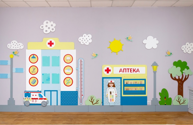 Нам очень хотелось, чтобы ожидание в коридоре очереди в медицинский кабинет было приятным времяпрепровождением. Более того, развивающим и полезным занятием! Поэтому мы добавили пиктограммы, которые помогут освоить важность гигиенических процедур, карточки с «лекарствами» в аптеке для игр по финансовой грамотности, а так же традиционные развивающие элементы для мелкой моторики. Подробнее