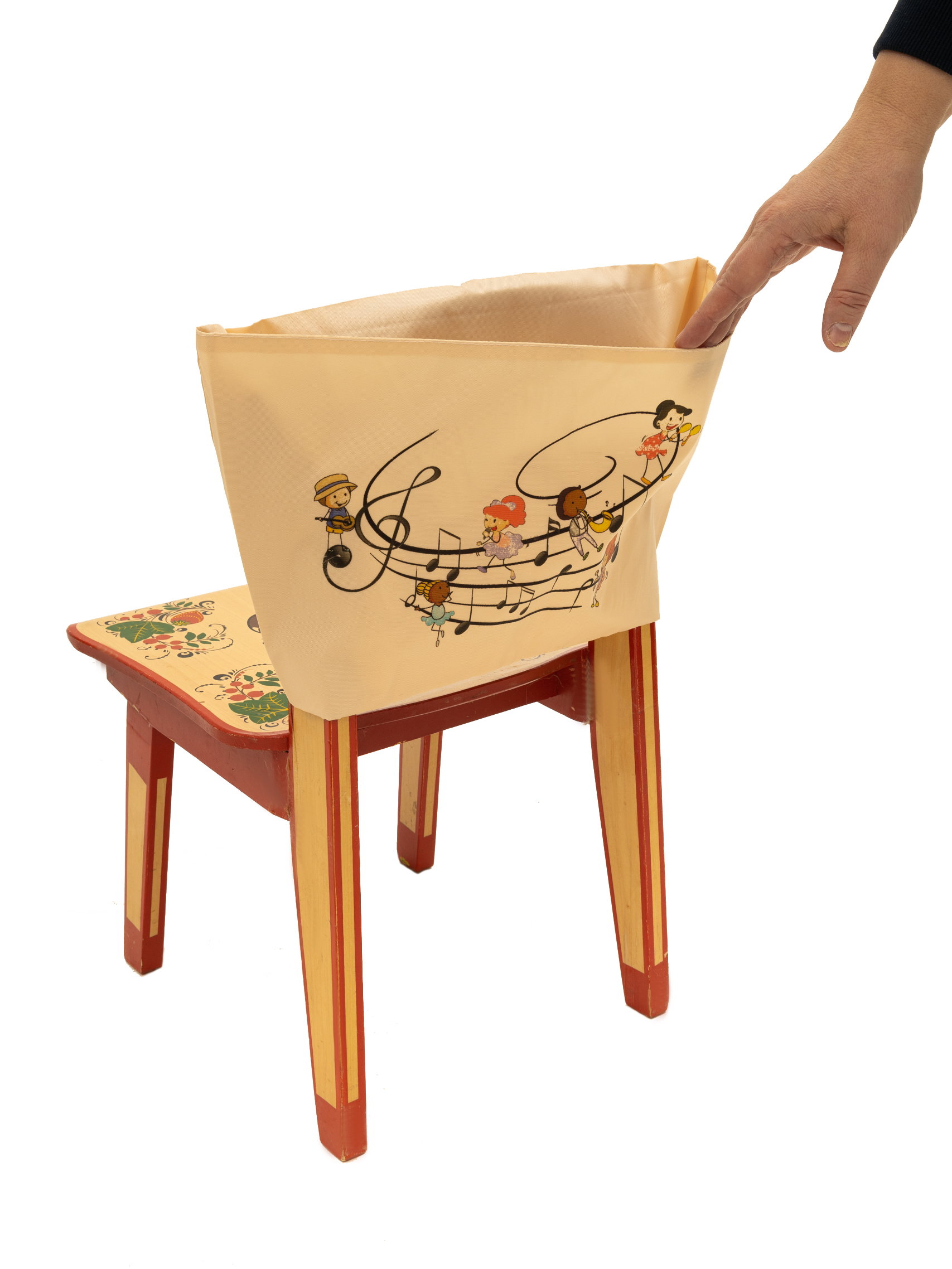 Описание: кармашек надевается на спинку стула. Выполнен в нейтральном цвете. С картинкой на музыкальную тематику. Он легко надевается, в объемный карман можно положить весь раздаточный материал для занятия или утренника.