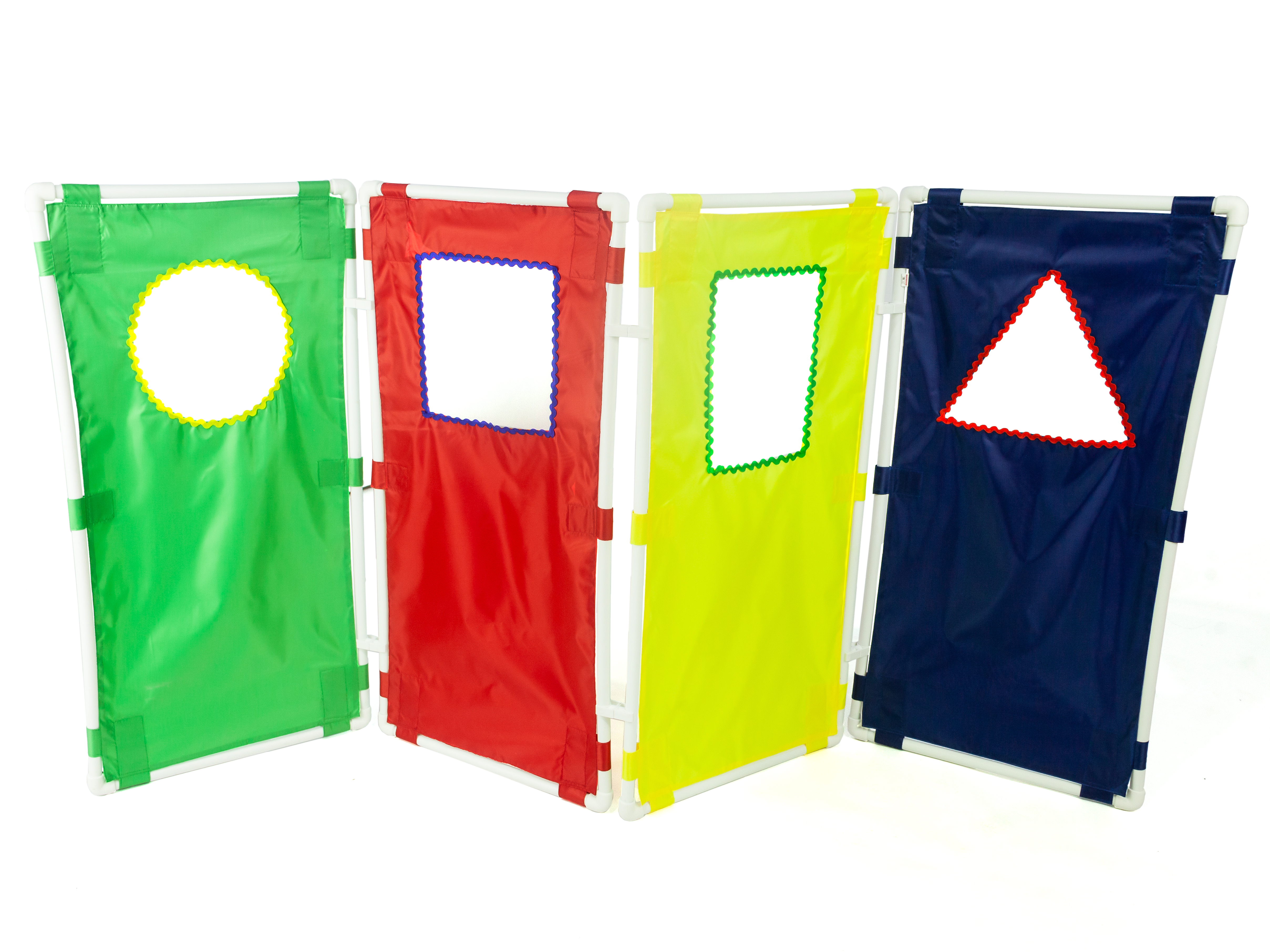 Цвет — желтый (прямоугольник),синий (треугольник), зеленый (круг), красный (квадрат). Материал: основа — тафетта 100% полиэстер Комплектация: 4 накидки, каждая пристегивается к ширме с помощью липучек, нашитых на ткань.