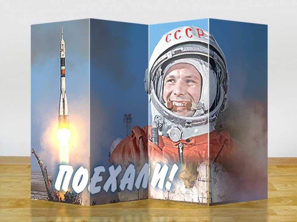 Напольная ширма гармошка "Гагарин" выполнена из МДФ с нанесением полноцветного рисунка с двух сторон ширмы. С обеих сторон ширмы изображон космос.Ширма состоит из четырех створок, скрепленных между собой на петлях. Для удобства в эксплуатации ширма складывается гармошкой и при хранении занимает мало места.