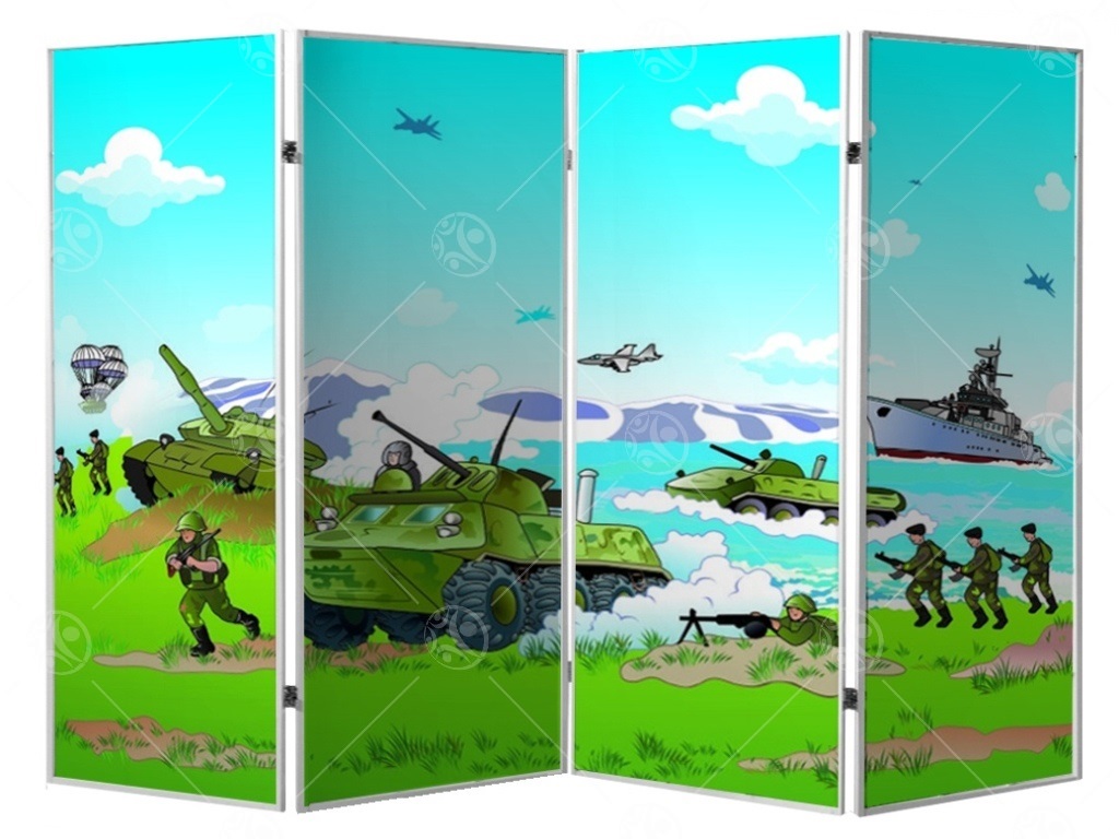 Напольная ширма гармошка "Военные" поможет познакомить воспитанников с военным делом или же послужит фоном для праздников на военную тематику. Она состоит из четырех створок, которые компактно складываются гармошкой. Высота ширмы 1,25м, ширина одной створки 0,5м.