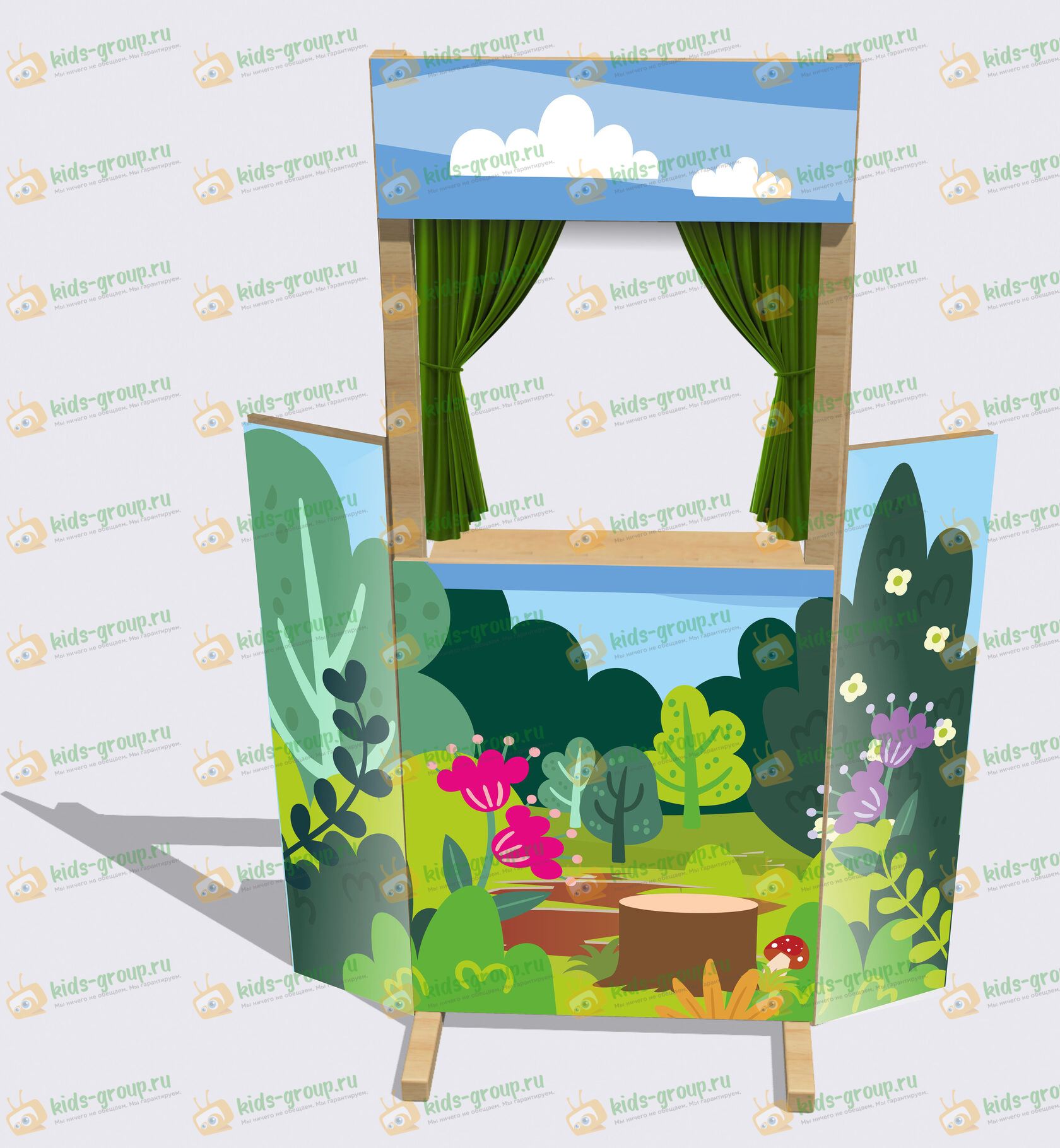 Качественная и надежная ширма для кукольного театра в детском саду. Материал: березовая фанера высшего сорта и массив дерева. Рисунок нанесен методом прямой УФ печати по дереву, яркий, не выцветет и не сотрется со временем. Мы используем безопасные краски и лаки.
