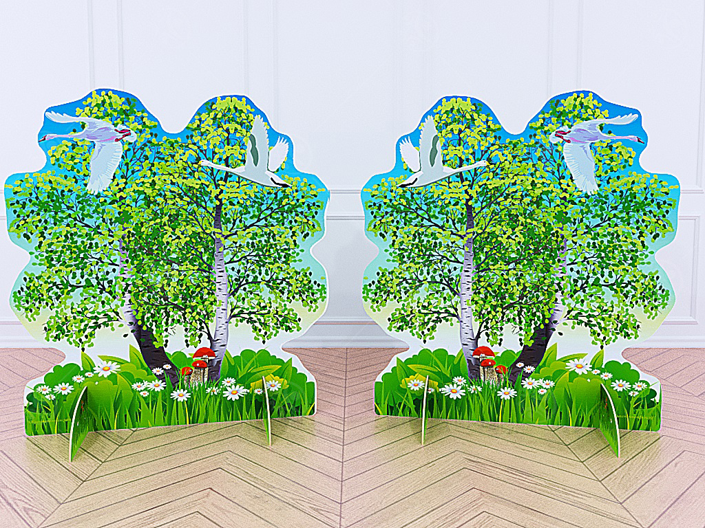 Театральная декорация "Береза с лебедями" выполнена из МДФ, с нанесением полноцветного рисунка с двух сторон. Высота декорации 1,28м, ширина - 1,18м.