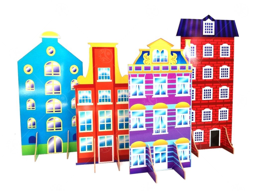 Театральная композиция "Городок" выполнена из МДФ, с нанесением полноцветного рисунка с двух сторон. Композиция состоит из четырех домов различных по высоте (от 0,7м до 0,9м), цветовой гамме и дизайну. Их можно использовать как вместе, так и по отдельности. "Городок" станет отличным дополнением и создаст городскую атмосферу на утреннике.