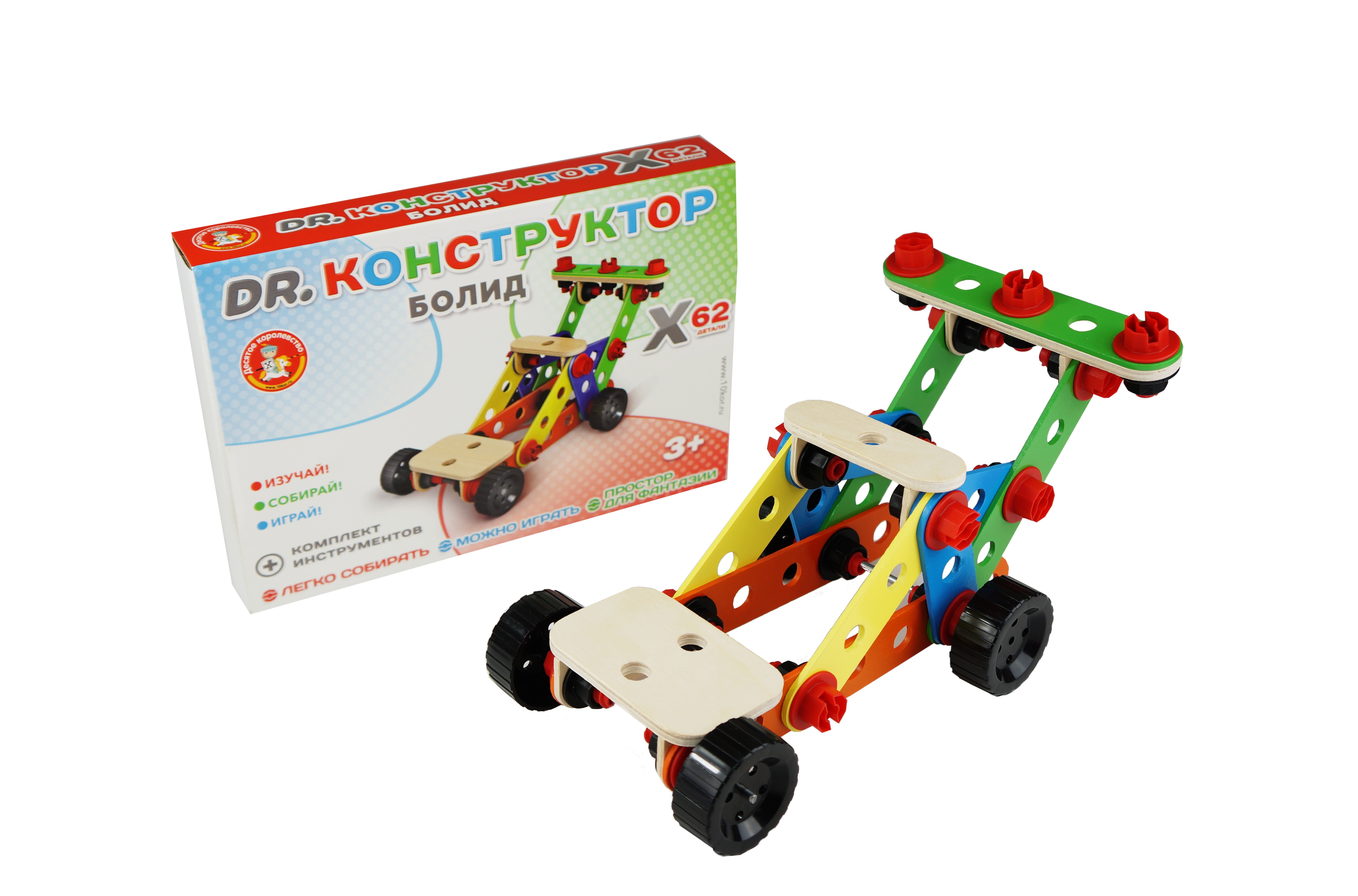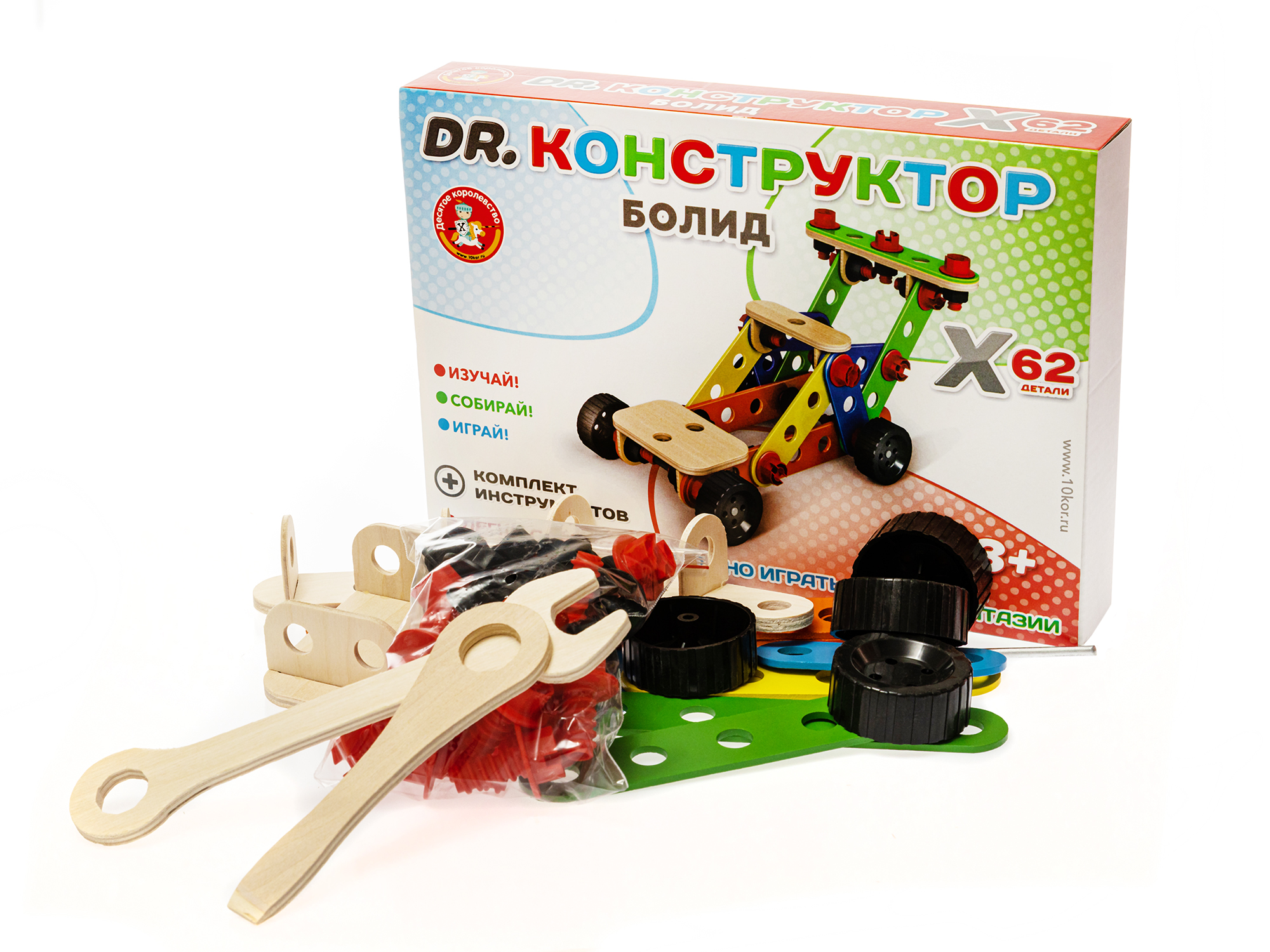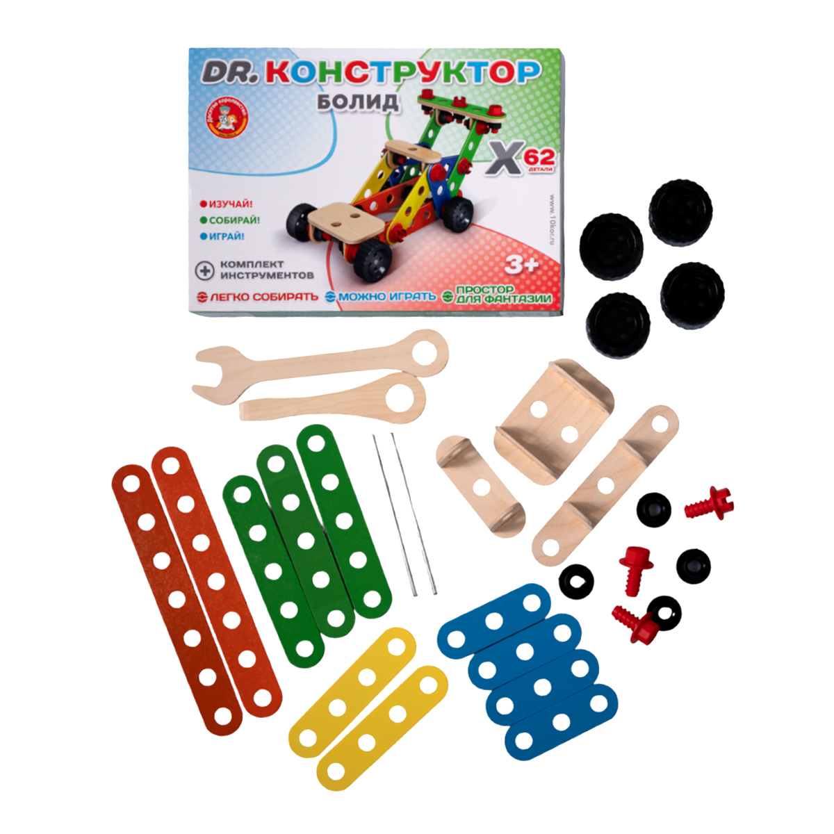 Деревянный конструктор Болид. Состав набора (всего 62 детали): колеса из пластика – 4 шт. (5 см), ось металлическая – 2 шт. (13 см), болты из пластмассы (красный цвет) – 20 шт., гайки из пластмассы (чёрный цвет) – 20 шт., деревянные планки (жёлтый, синий, оранжевый, зелёный, неокрашенные детали) – 14 шт. ( 9 – 22,5 см), ключ и отвертка из фанеры. Игра предназначена для детей от 3 лет. Материалы: дерево, фанера, с элементами из МДФ, пластмассы и металла. Игра предназначена для детей от 3 лет. Игра с деревянным конструктором позволяет проявлять фантазию и экспериментировать с игрушкой, развивает воображение, логическое мышление и моторику рук.