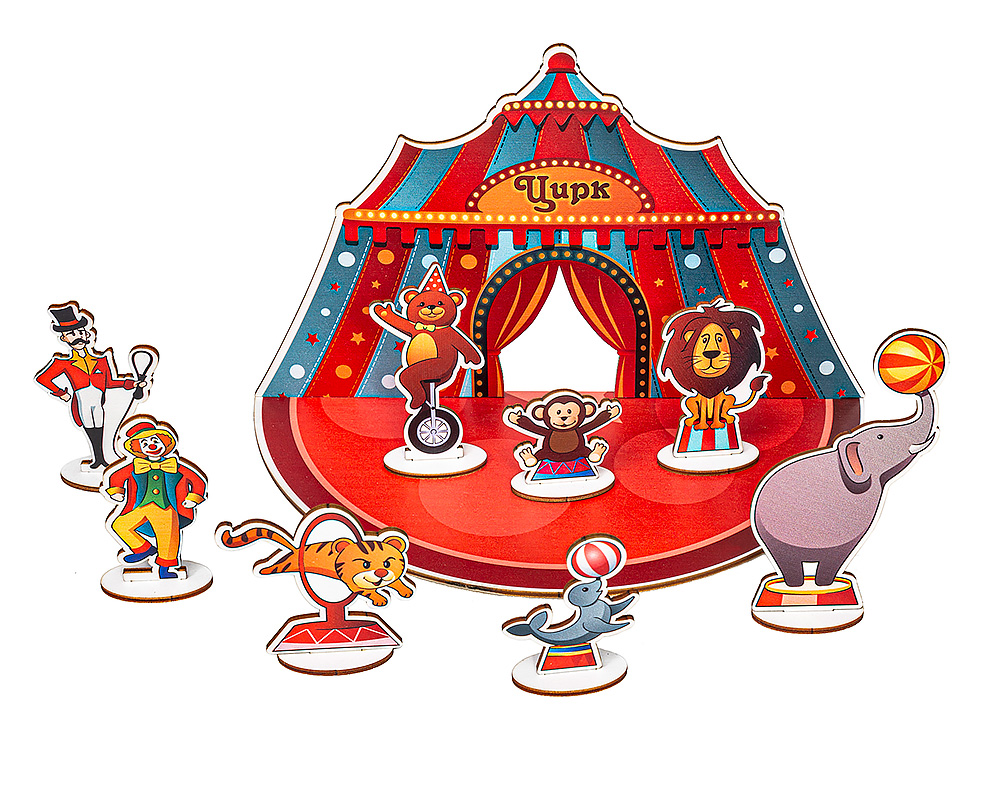 1. Предложите ребенку отправиться на экскурсию в цирк. Расскажите, что цирк – это место, где выступают цирковые артисты, которые показывают красивые, интересные и яркие номера. В середине цирка находится арена (манеж), вокруг которой расположены места для зрителей. В цирке есть ведущий – конферансье. Уточните у ребенка, какие артисты и животные будут участвовать в цирковом представлении и расположите их на арене цирка.