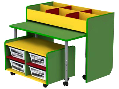Выполнен из ламинированной ДСП (ЛДСП) 16 мм, обрамлены кантом ПВХ 2 мм, все углы закруглены.В комплект входят: тумба с ячейками 1060х480х780; стол прямоугольный на регулируемых ножках выкатной 1000х470х460-520-580; тумба выкатная 750х450х430; набор корзин (400х300х120 - 4 шт.). Цвет на выбор.