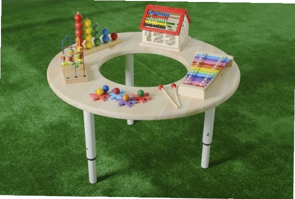 Материал - Березовый мультиплекс 15 мм, Покрытие - бесцветный лак, Ножки телескопические, регулировка 0-1-2-3 г.р. Столешница круглой формы диам 800 мм. На поверхности расположены различные игровые и музыкальные элементы