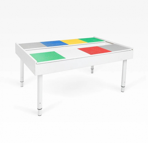 Материал - МДФ 16 мм, Покрытие - белая эмаль. Ножки телескопические, регулировка 0-1-2-3 г.р. Под рабочими местами скрывается отсек для хранения Лего деталей. По центру общий отсек для хранения общих деталей