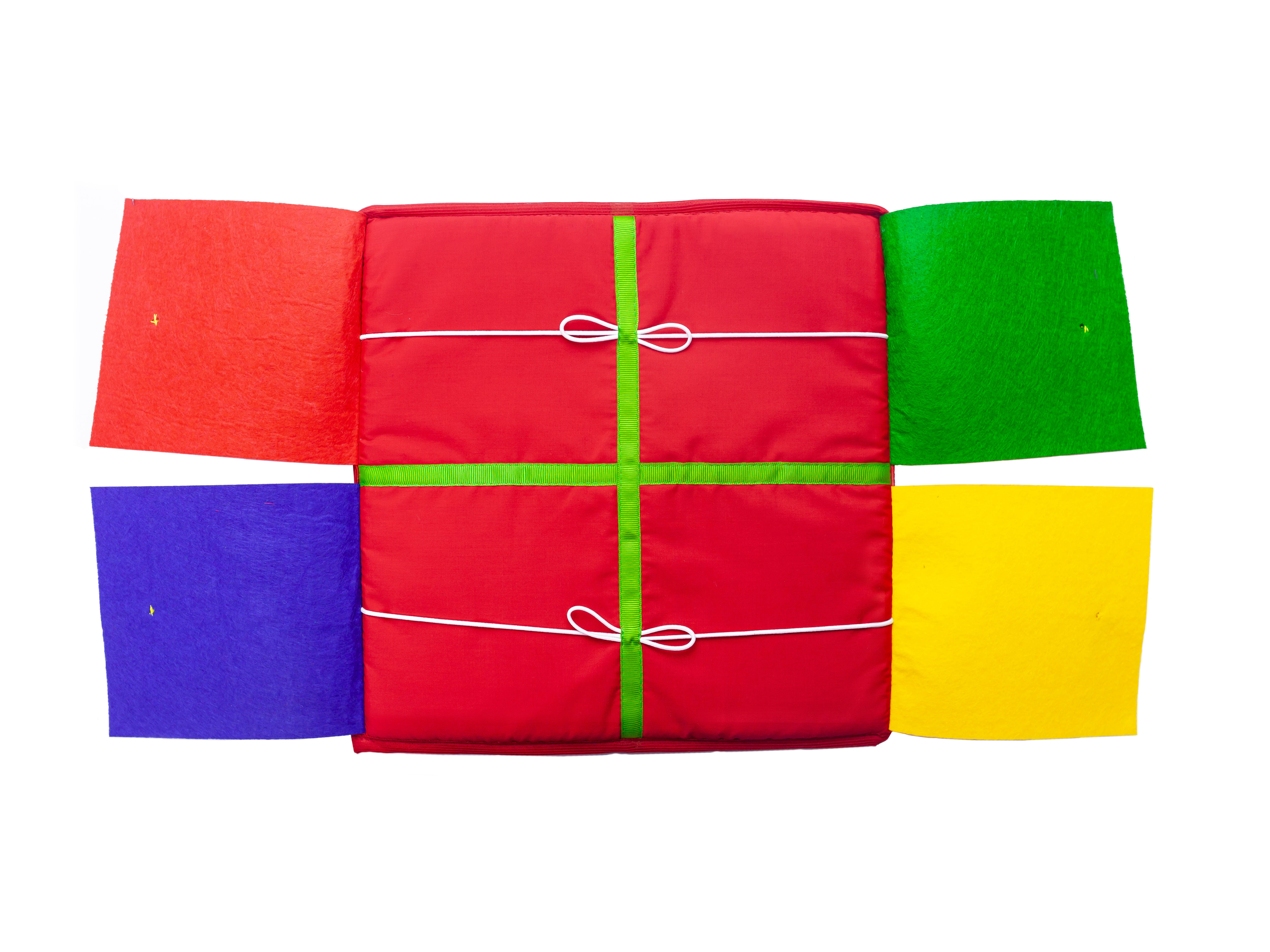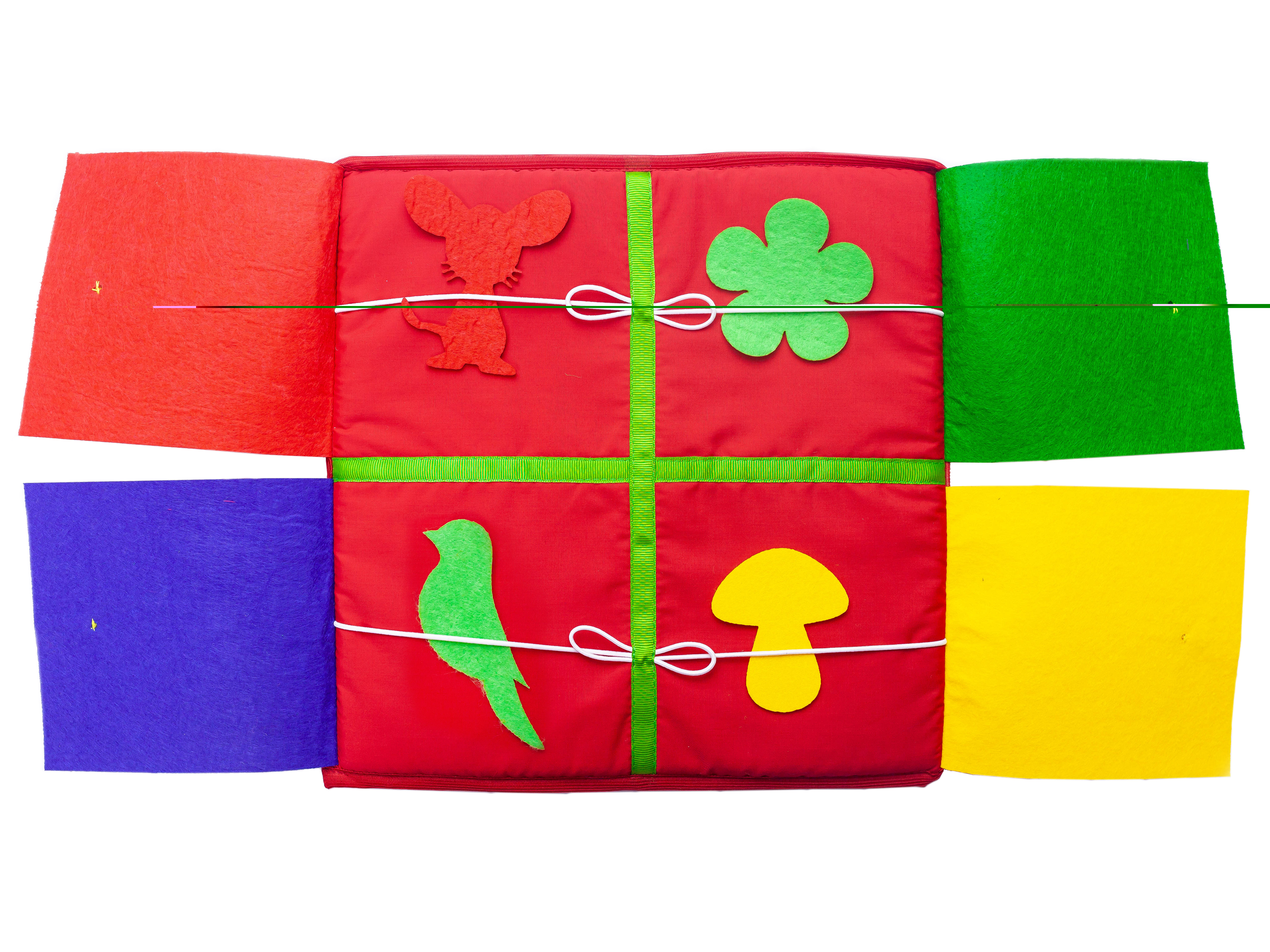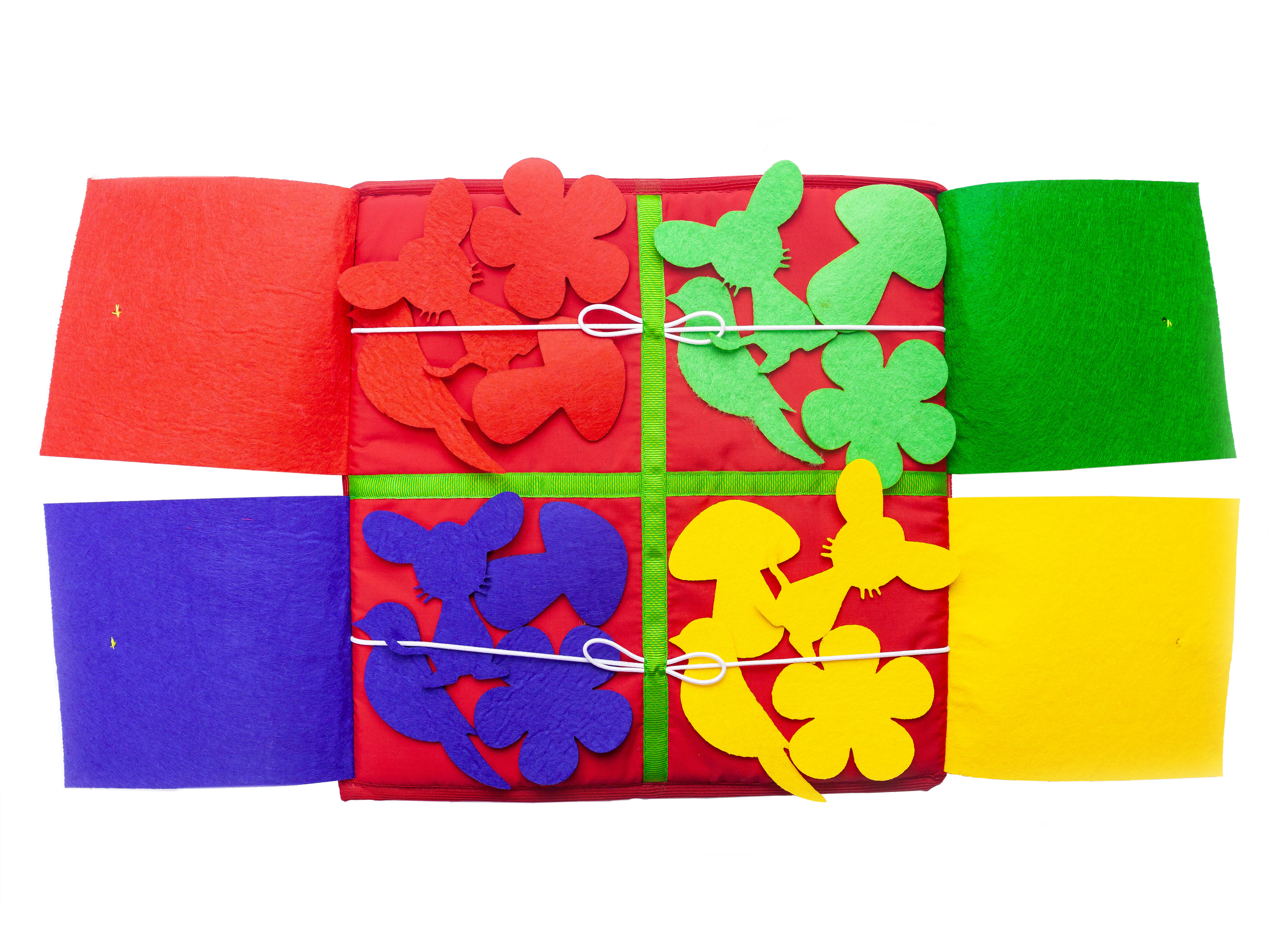 Материал: материал основы — смесовая ткань — 35% хлопка, 65% полиэстера, внутри — геовойлок — 100% полиэстер. Комплектация: На квадрате 4 дверки с застежкой на пуговицу. Сзади – один карман из сетки с застежкой на молнию. В комплект входят 4 цветочка, 4 грибочка, 4 птички, 4 мышки. Каждая фигурка – четырех основных цветов (синяя, красная, желтая и зеленая).Размер: 30х30 см.