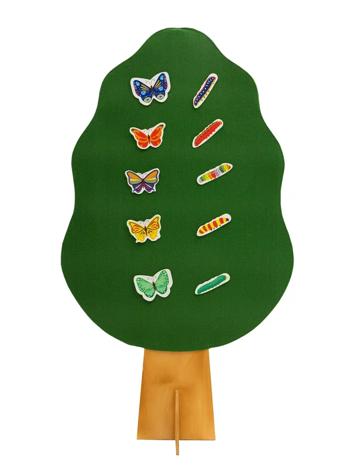 Описание: 5 бабочек и 5 гусениц из фетра с наклейкой. Бабочки и гусеницы подбираются парами в зависимости от цвета.