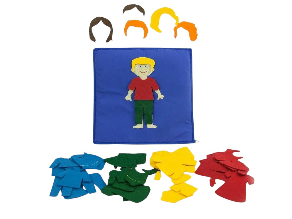 Материал: основа — смесовая ткань — 35% хлопка, 65% полиэстера, внутри — геовойлок — 100% полиэстер. Комплектация: спереди на ткань нашит фетровый человечек, сзади 4 кармана на молнии. В комплект входит: одежда и обувь (синий, красный, желтый, зеленый) — куртка, теплые штаны, шапочка, пуловер, футболка, шорты, брюки, юбка, платье, трусики с маечкой, туфли, сапоги; прически — 6 штук (3 для мальчика, 3 для девочки).