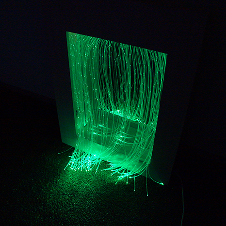 Фибероптические волокна в оболочке на фоне безопасного зеркала. Светодиодный источник света встроен в корпус, нити распределены по всей ширине. Оптоволокно диаметром 2 мм. в оболочке проводит только свет и абсолютно безопасно, его можно перебирать в руках и гнуть в разные стороны.