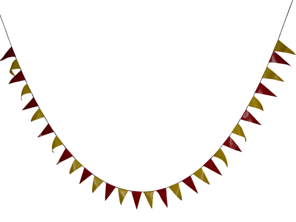Представляет собой нанизанные на шнур на одинаковом расстоянии друг от друга небольшие разноцветные треугольные флажки. Размер флажков 10х20см. Длина 5м.