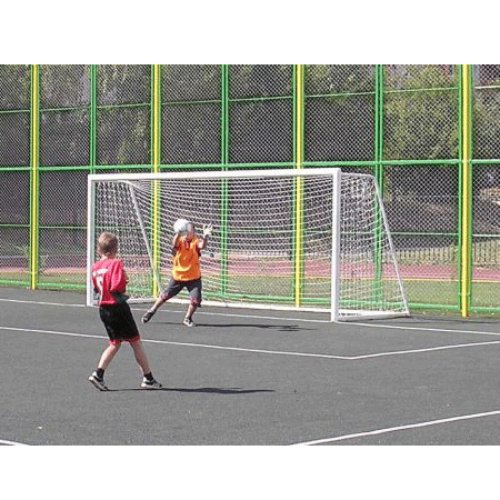 Размеры (внутренние): 2х5м, глубина 1,0/1,2м. Круглый стальной профиль диаметром 89мм. (в соответствии с ГОСТом) с безопасными петлями для крепления сетки. Ворота представляют собой цельносварную или сборную конструкцию, состоящую из боковин, которые крепятся между собой перекладинами, с помощью болтовых соединений. Для установки на улице требуется приобретать комплект стаканов. Задняя рама ворот изготавливается из круглого профиля диаметром 32 мм. Конструкция окрашена белой порошковой краской.