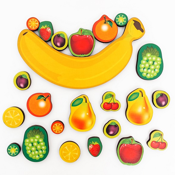 Раскладывать фрукты можно по одному, можно одновременно по два. Научите ребёнка поддерживать банан, если он чувствует, что сейчас он упадет, а также, вовремя убирать деталь или сразу же приводить в баланс другой деталью.