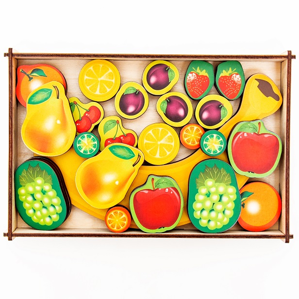 Разложите перед ребёнком все детали – фрукты и ягоды, хорошенько перемещайте между собой. Предложите разложить детали на две группы: фрукты и ягоды. Формируем понятие группа, тренируем умение выделять признаки предмета, сравнивать и классифицировать, отрабатываем категории фрукты, овощи, развиваем кругозор.