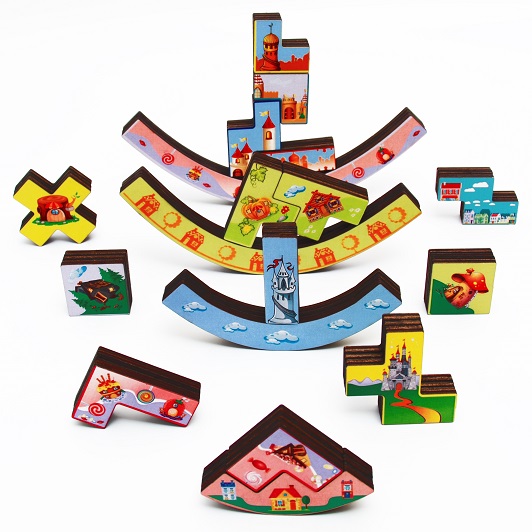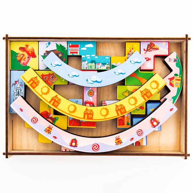 Три большой фигурки-дуги (две из которых равного размера, одна поменьше), 15 деталей разнообразных форм (по типу фигур игры тетрис), деревянная коробочка для хранения деталей. Детали разных цветов и рисунков. На деталях изображены разные сказочные дома и замки. Деревянную коробочку, в которой лежит игра, можно использовать как материал для новой игры, разбирать и собирать, тренируя мелкую моторику и логику.