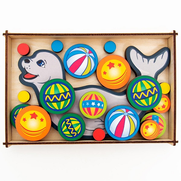 Фигурка тюленя, 20 деталей-кружочков, деревянная коробочка для хранения деталей. Кружочки разных размеров: большие, средние, маленькие, самые маленькие. Разной толщины, цветов и узоров. Деревянную коробочку, в которой лежит игра, можно использовать как материал для новой игры, разбирать и собирать, тренируя мелкую моторику и логику.