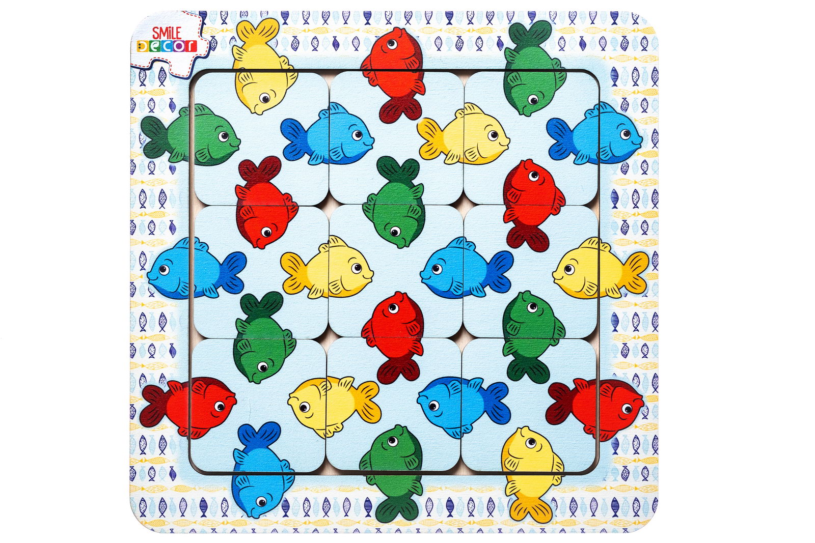4. Игра «Морские рыбки». Предложите ребенку отпустить рыбок из аквариума в море: извлеките все элементы из рамки, один квадрат разместите в центре стола и попросите ребенка собрать элементы головоломки без использования рамки-основания.