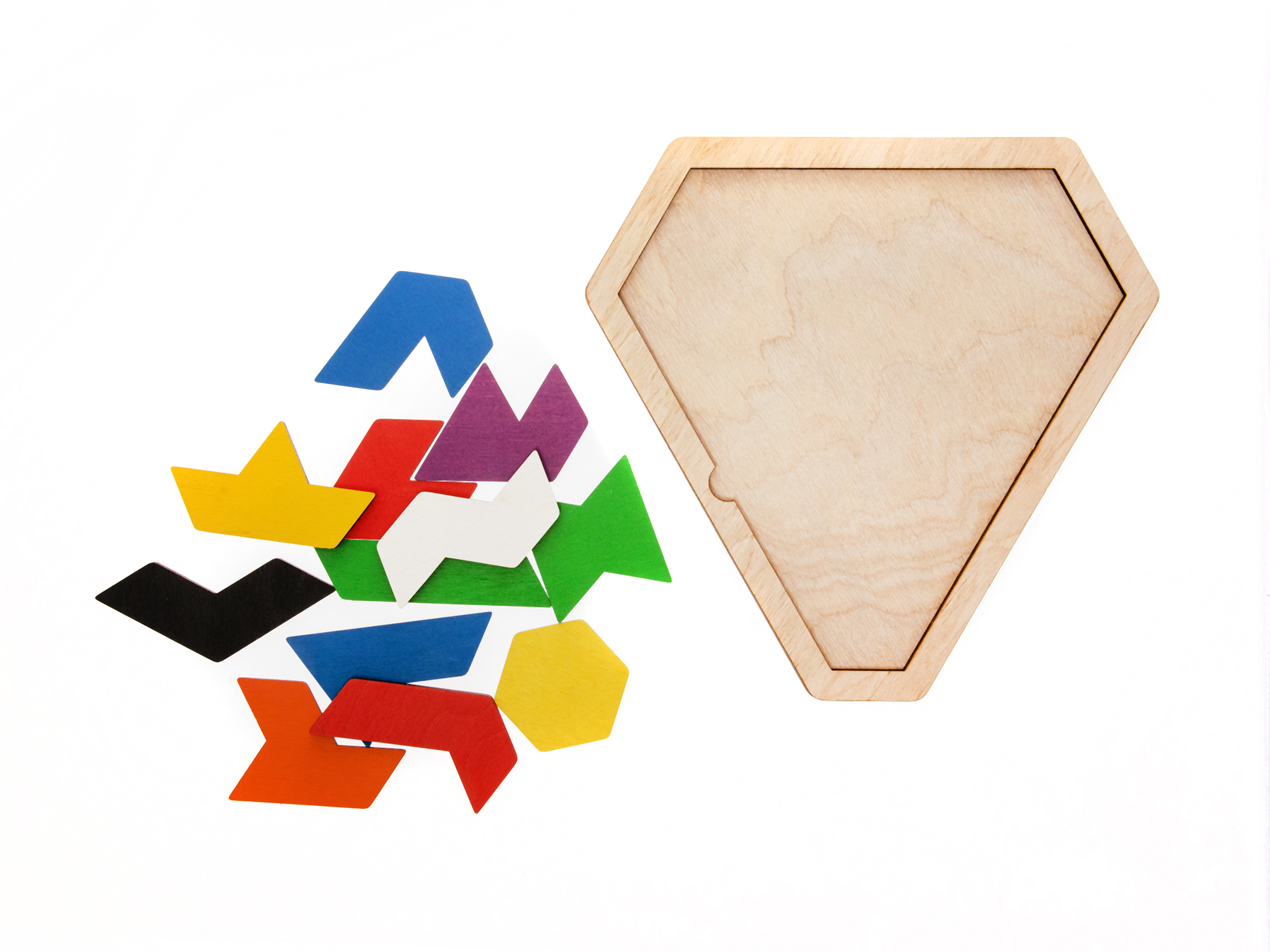 Детский пазл «TETRISDIAMOND» – это деревянная версия классической компьютерной головоломки «Тетрис». Состав игры: игровое поле (27 х 27 см); детали пазла – 12 шт. (от 4,5 до 9 см; цвета – чёрный, оранжевый, жёлтый, зелёный, синий, красный, белый, фиолетовый). Материал: берёзовая фанера толщиной 4 мм. Игровое поле имеет углубление, в котором необходимо расставить пазлы различных цветов таким образом, чтобы все они уместились на игровом поле, соединяясь друг с другом. Головоломка знакомит ребёнка с понятием частей и целого, развивает логическое и пространственное мышление, мелкую моторику, зрительное восприятие, усидчивость, а также учит отличать основные цвета и формы.