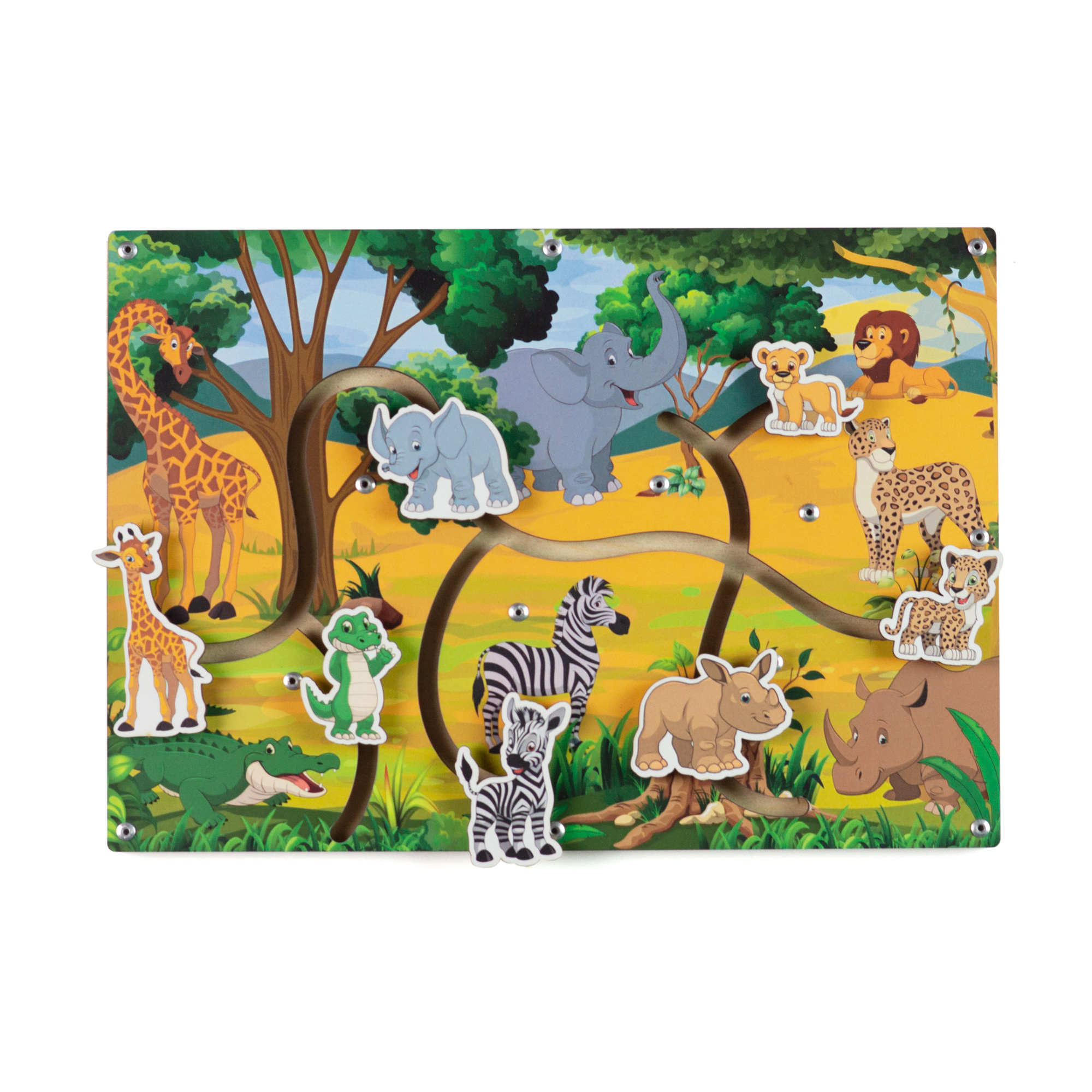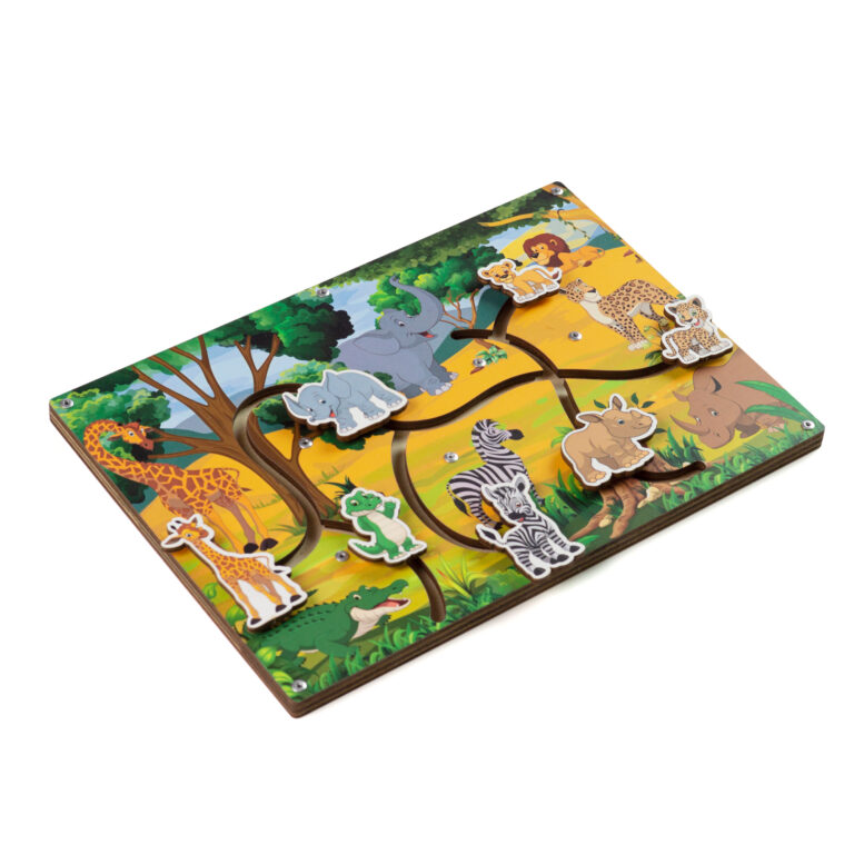 Сортер – лабиринт представляет собой деревянную панель с изображением саванны и ее обитателей: лев, слон, жираф, леопард, крокодил, носорог и зебра. На штангах изображены – детеныши животных. Прорези - дорожки для их передвижения.