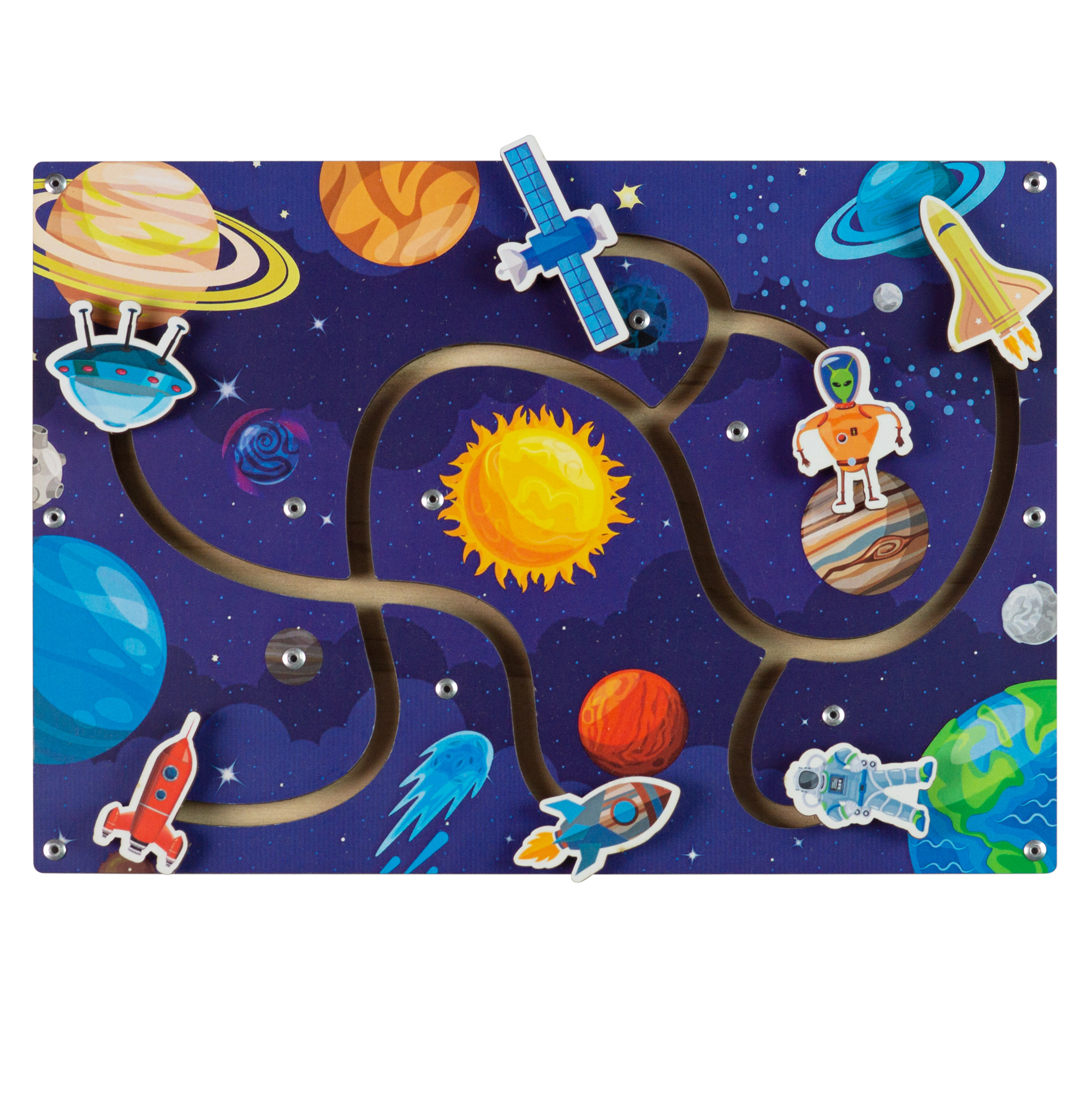 Сортер – лабиринт представляет собой деревянную панель с изображением космических глубин с планетами. На штангах - ракеты, разных цветов, космическая станция и космонавты для передвижения по прорезям - дорожкам.