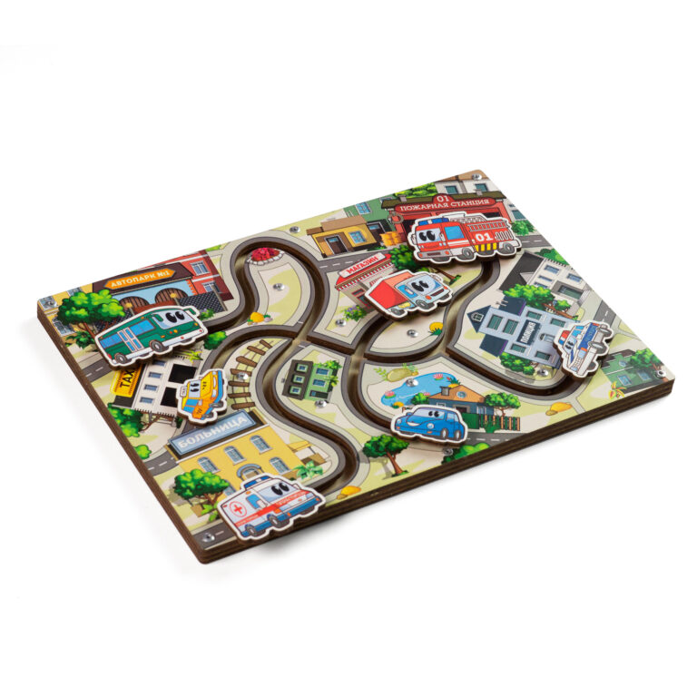Сортер – лабиринт Городские машинки представляет собой деревянную панель с изображением города: улиц, домов, пожарной станции, магазина, полиции, больницы, автопарка и такси. Улицы представляют собой прорези – дорожки (лабиринт), по которым передвигаются машины.