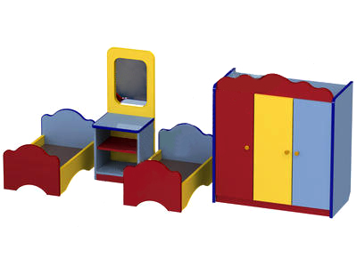 Комплект спальной мебели М-14. Выполнен из ламинированной ДСП (ЛДСП) 16 мм, обрамлен кантом ПВХ 2 мм, все углы закруглены. Предназначен для кукольного уголка. У трехстворчатого шкафчика: слева - полки для кукольного белья, справа – платяной шкаф с перекладиной для плечиков. Также в комплект входят: трюмо с зеркалом и две кроватки, предназначенные для кукол или игрушек до 66 см. Комплект спальной мебели прекрасно подойдет для сюжетно-ролевых игр, которые помогут развить у ребёнка аккуратность, трудовые навыки, навыки самообслуживания и заботливого отношения. Цвет на выбор. Возможно изготовление с фотопечатью.
