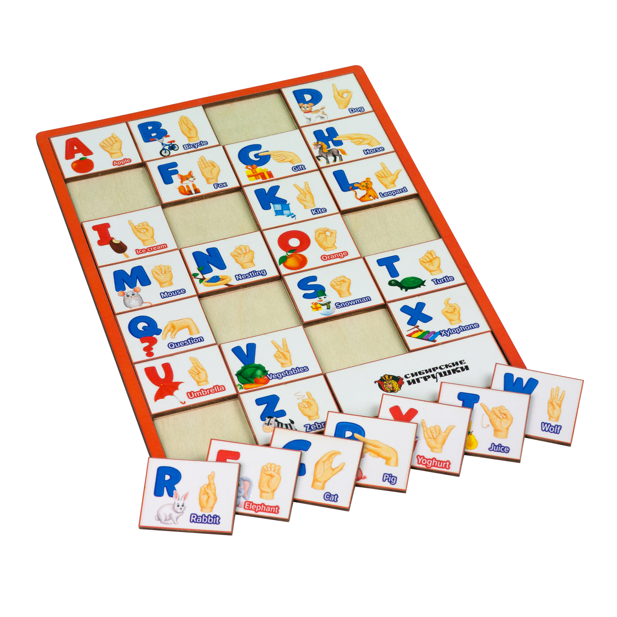 Английский алфавит. Под каждой буквой находится картинка, название которой начинается с данной буквы, а так же жест, который обозначает эту букву.