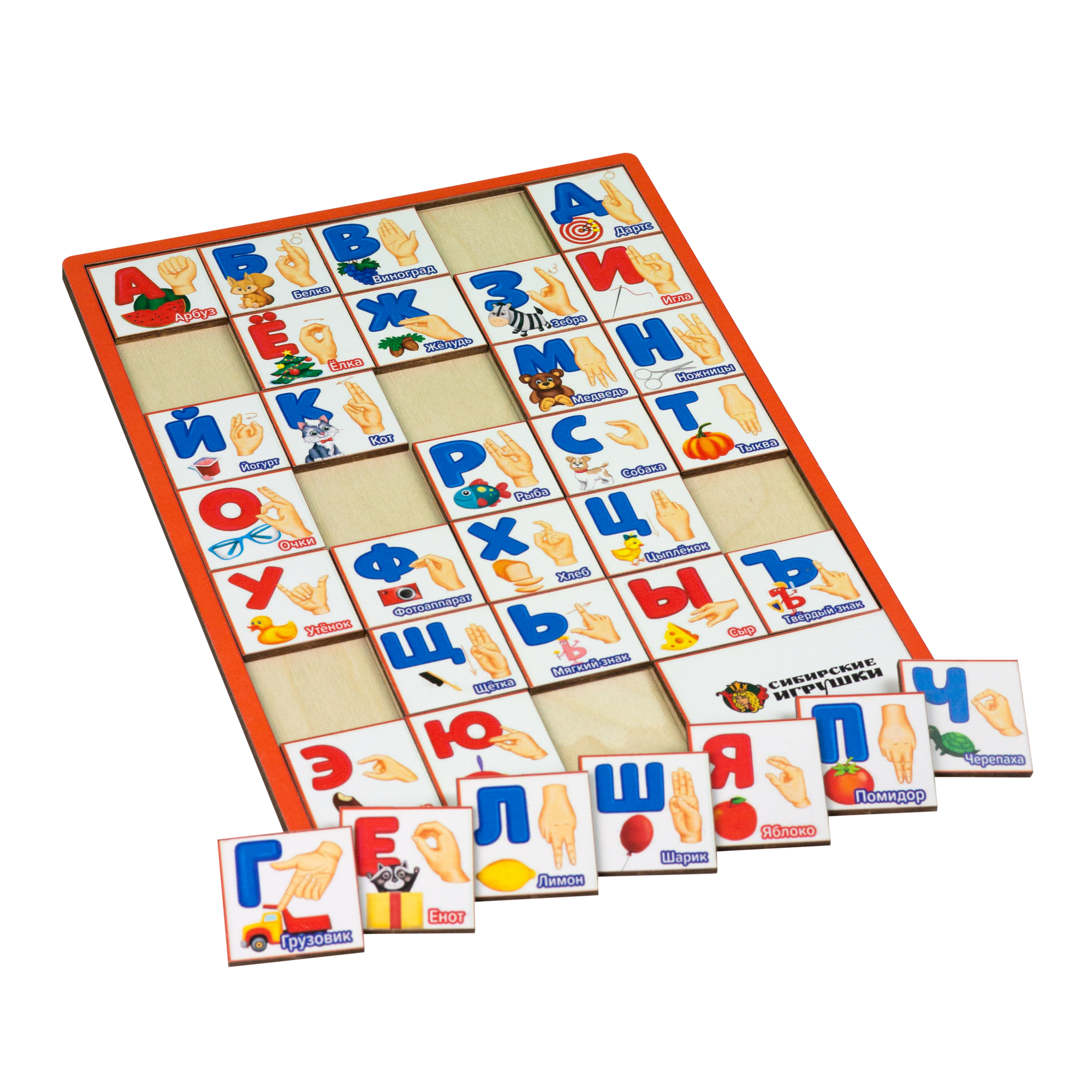 Русский алфавит. Под каждой буквой находится картинка, название которой начинается с данной буквы, а так же жест, который обозначает эту букву.
