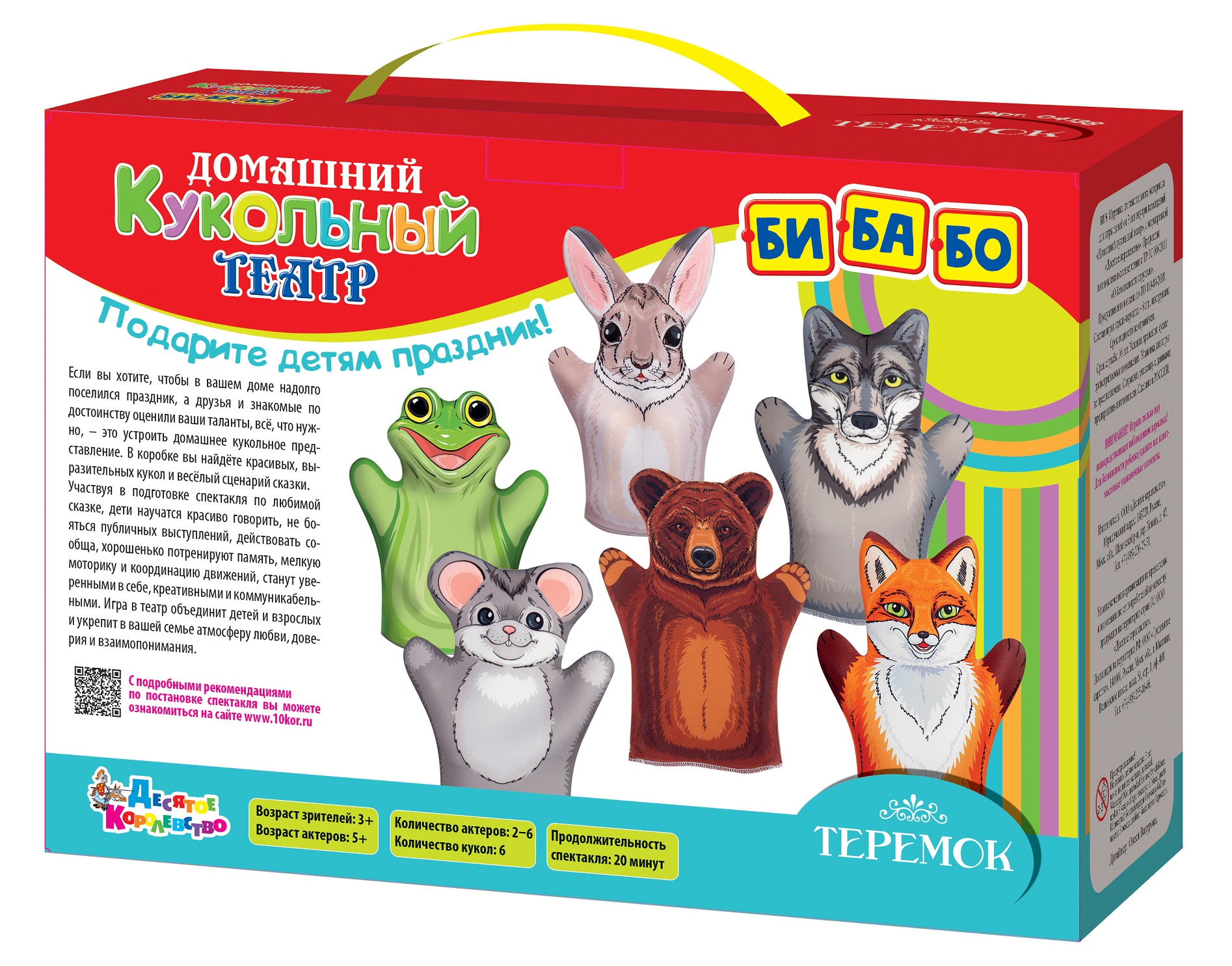 Домашний кукольный театр «Теремок» (серия «Би-ба-бо»). Состав набора: 6 кукол-перчаток (Мышка, Заяц, Лягушка, Лиса, Волк, Медведь; размер: 25 х 18 см), инструкция со сценарием в стихах. Материалы: текстильный материал, бумага. Предназначено для детей от 3 лет, для 2–6 участников. Домашний театр разовьёт в детях творческие способности, речь, фантазию и коммуникабельность, а также потренирует память и мелкую моторику рук.