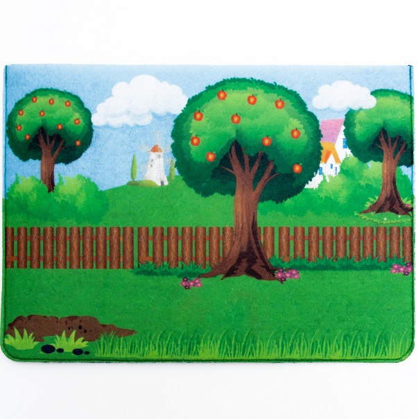 Фетровый конверт с изображением огорода с забором. Фигурки из фетра с ли: репка, дед, баба, внучка, собака жучка. Геометрические фигуры: круг 4 см. желтый, круг 6 см. красный, квадрат 3 см. зеленый, квадрат 4 см. желтый, прямоугольник 3*6 синий, прямоугольник 4*7 зеленый, треугольник 4 см. красный, треугольник 5 см. синий.