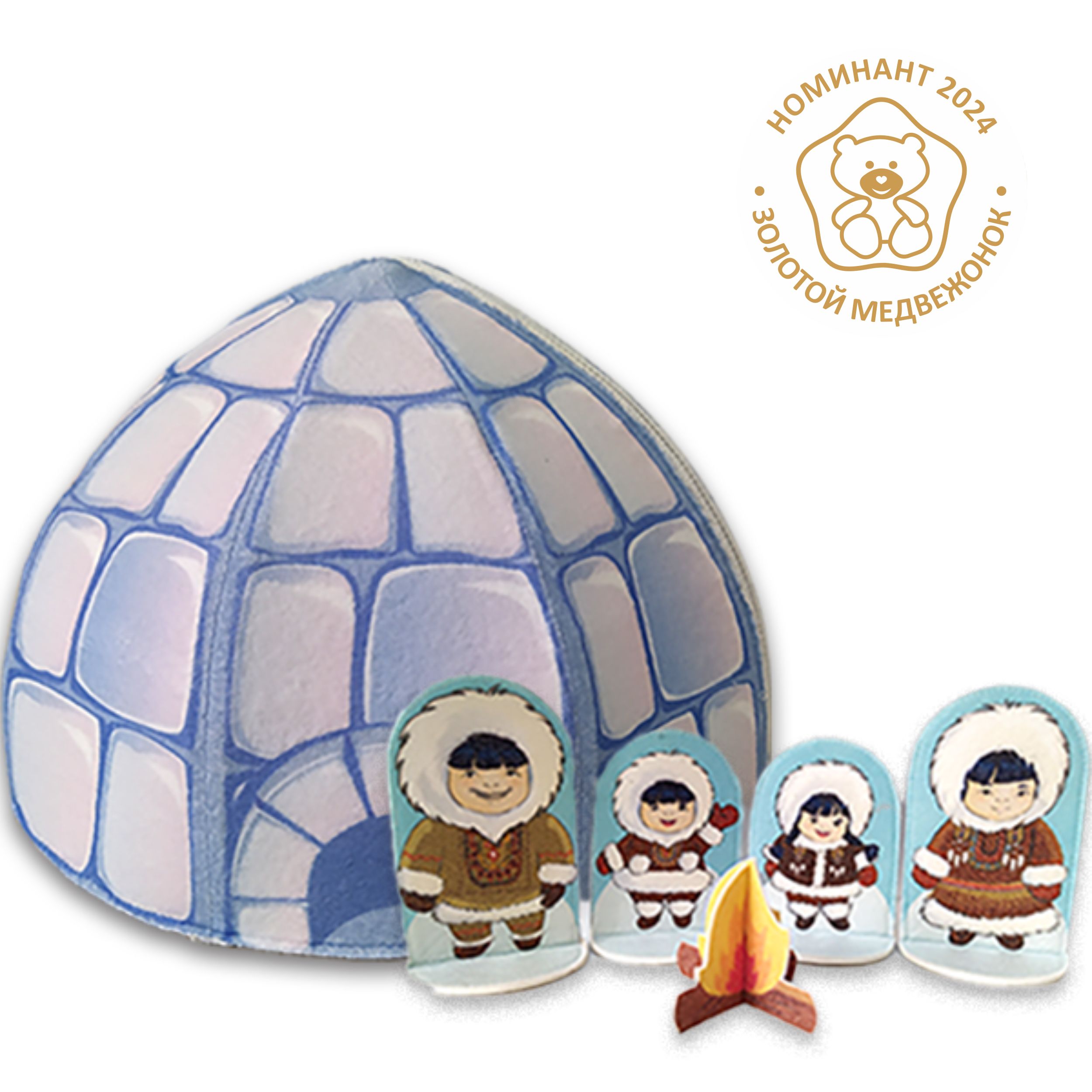 Иглу выполнено из фетра с нанесенным методом сублимационной печати ледяных блоков и национальным орнаментом, имеет молнию, что позволяет многократно разбирать и собирать изделие без потери прочности. В комплект входят очаг и 4 фигурки в национальных костюмах, выполненные из фетра. Подробнее