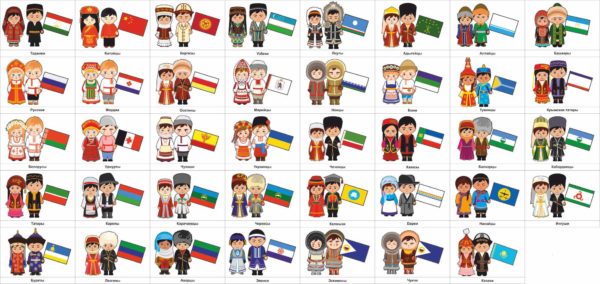 фигурки девочки и мальчика, которые можно одевать в народные костюмы (крепятся на липучки); костюмы народов: русские, украинцы, белорусы, чеченцы, татары; + 4 костюма для девочки «Народные промыслы» (гжель, жестово, хохлома, дымка)