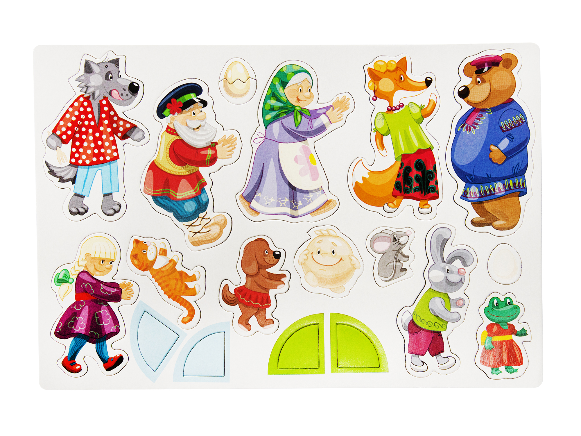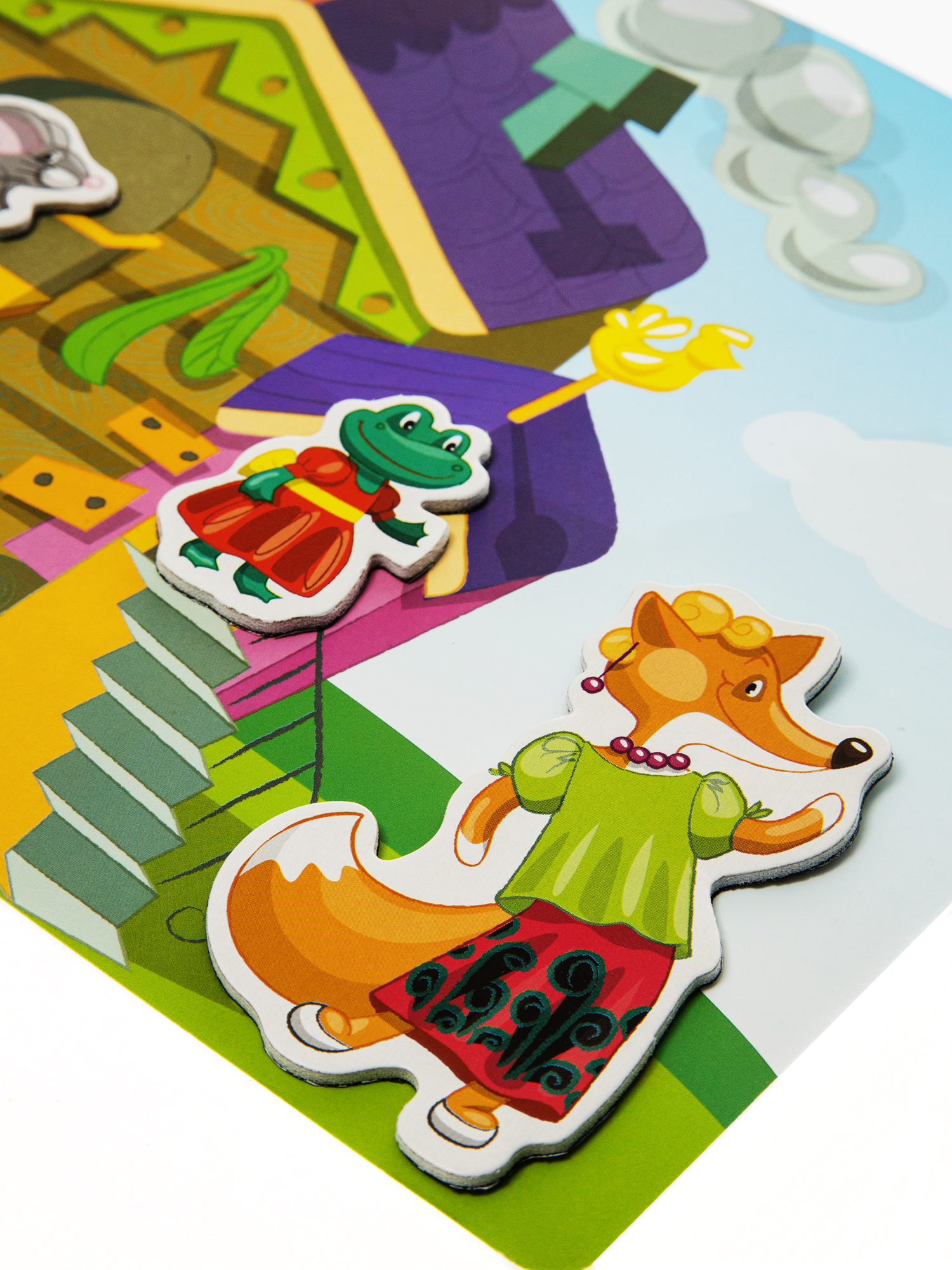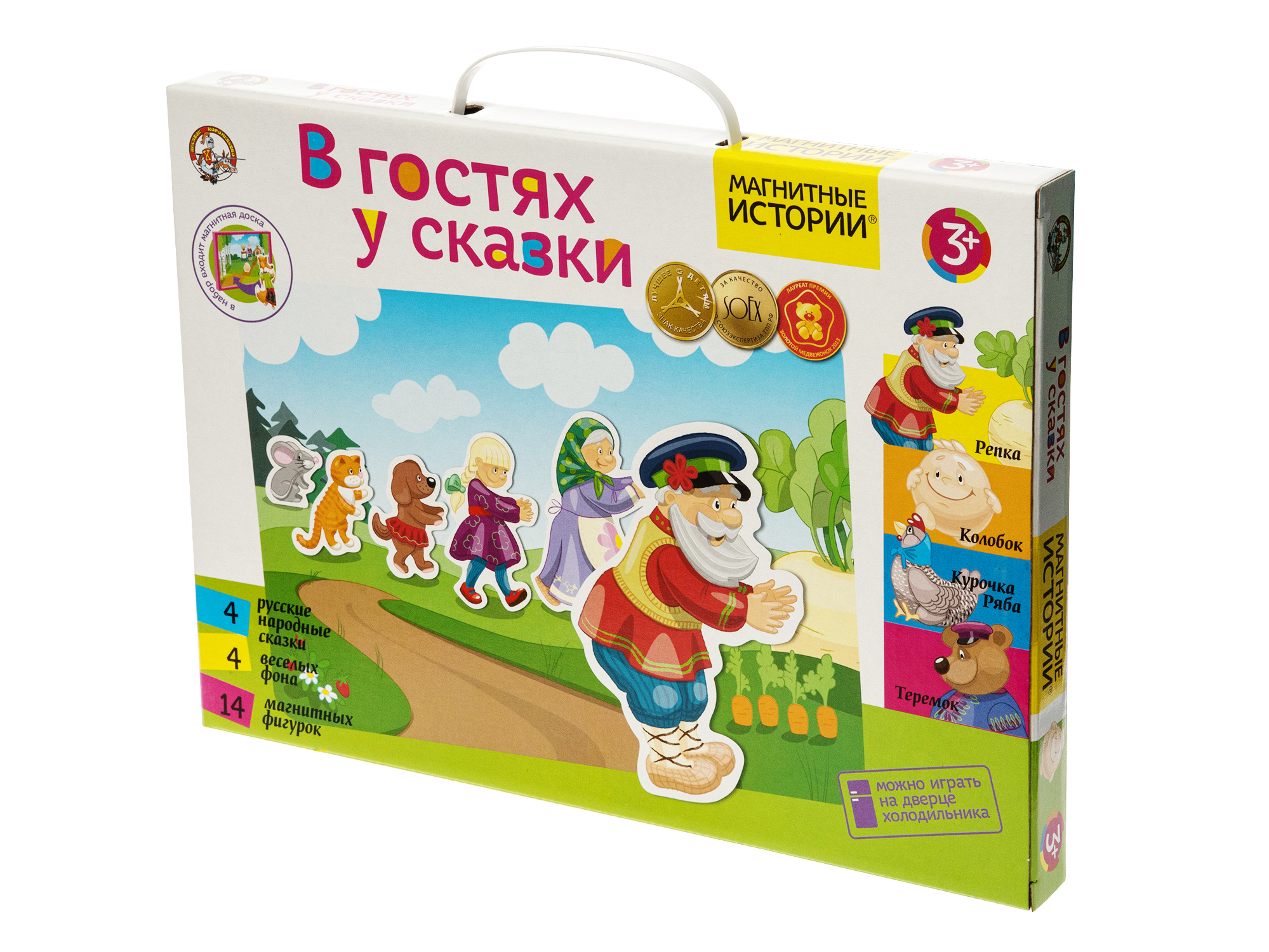 Магнитная развивающая игра «В гостях у сказки». Состав: магнитный планшет (35,5 х 25 х 2 см), двухсторонние игровые поля – 2 шт., магнитные фигурки – 14 шт. (высота – от 2,5 до 11 см), магнитные уголки для фиксации полей – 4 шт. (высота – 2,5 см). Материалы: картон, полимерный материал, магнитный винил, металл. Персонажи и фоны позволяют играть 4 русские народные сказки: Репку, Теремок, Колобок и Курочку Рябу.